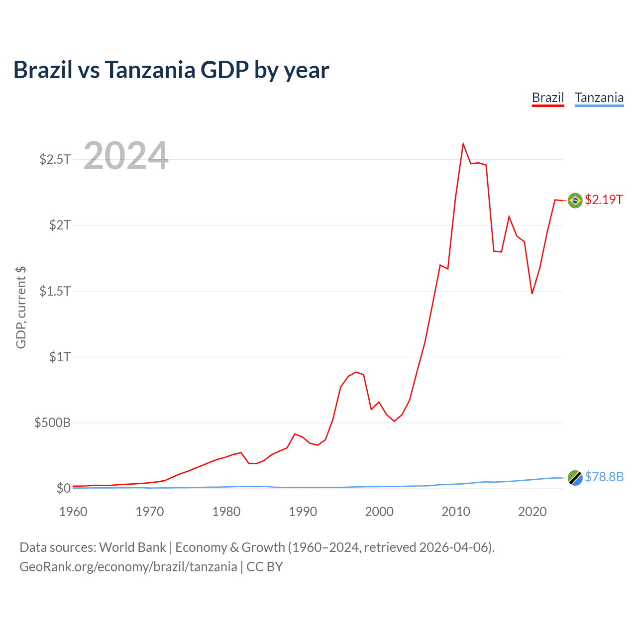 Brazil has a GDP of $2.19T compared to $78.8B for Tanzania, ranking 10/197 and 82/197 by economy size, respectively.