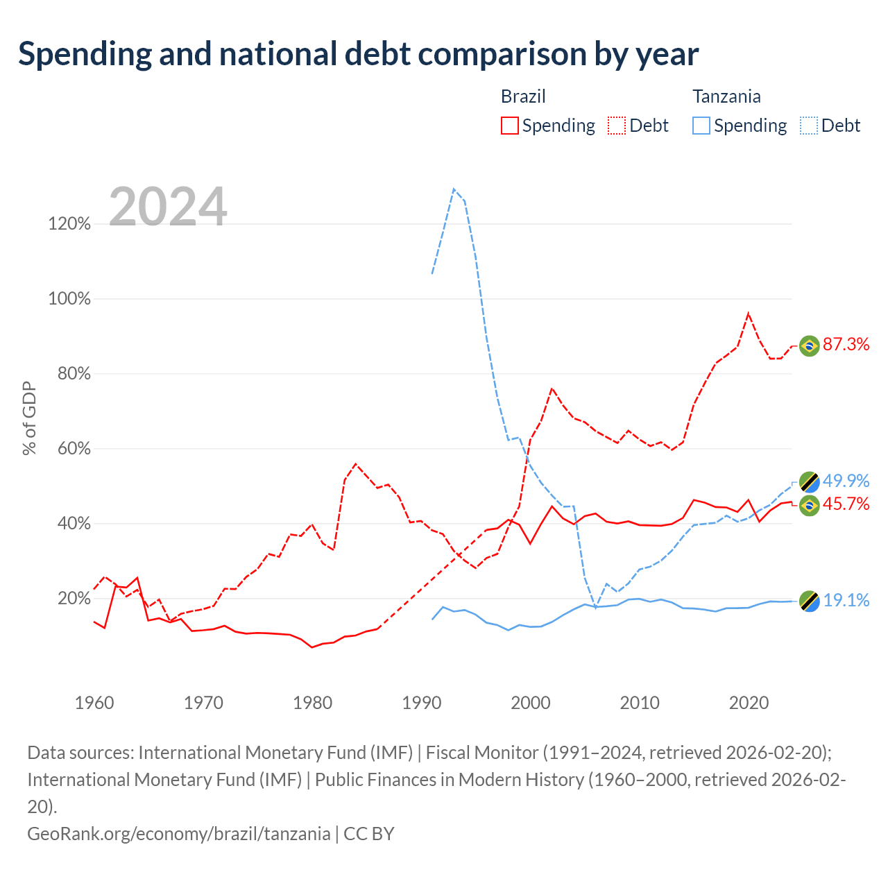 Brazil has $1.91T in government debt (87.3% of GDP), compared to $39.3B (49.9% of GDP) in Tanzania.