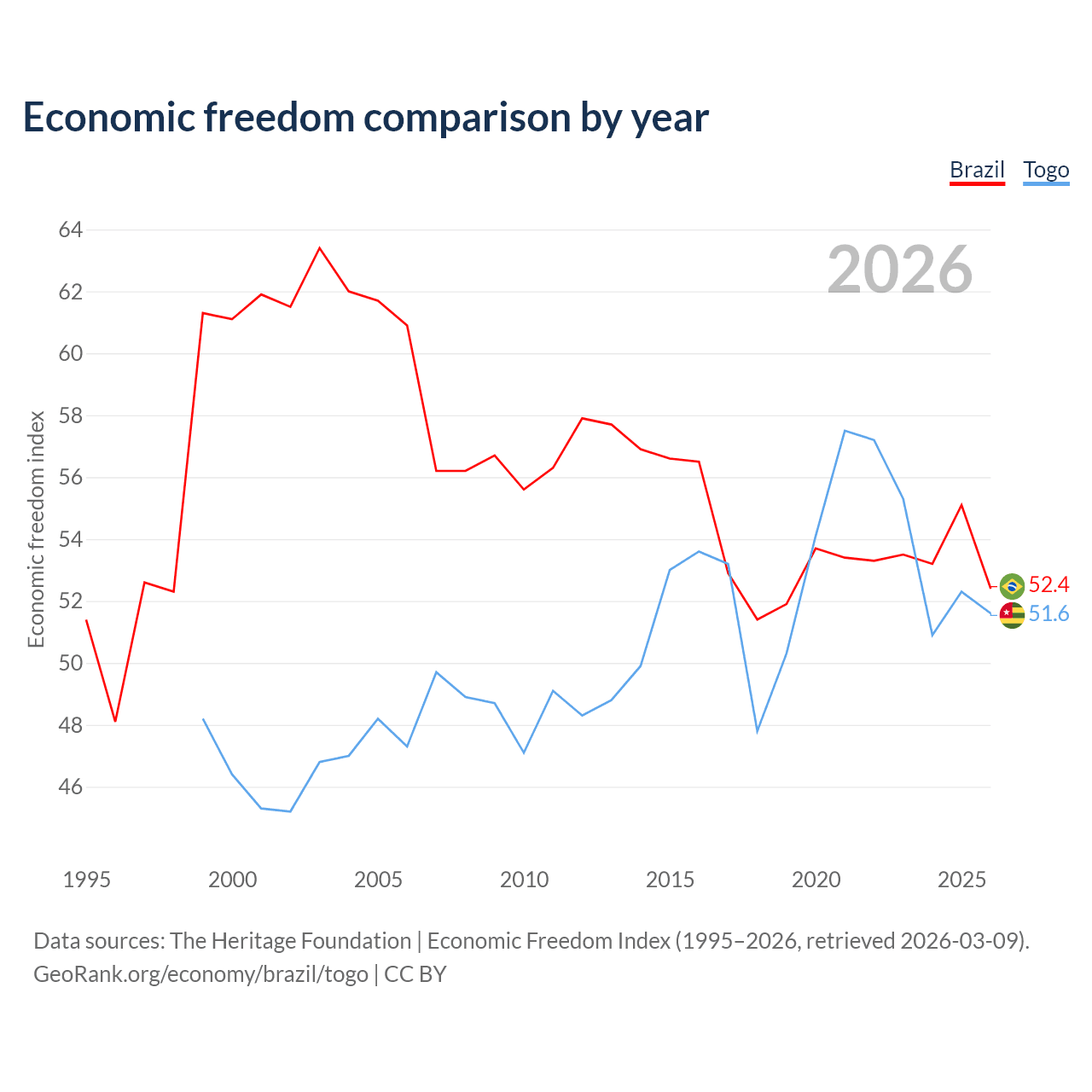 The Economic Freedom Index for Brazil is 52.4, ranking 148/197, compared to 51.6 for Togo, ranking 153/197. The chart above displays a comparison of annual changes in economic freedom indexes.