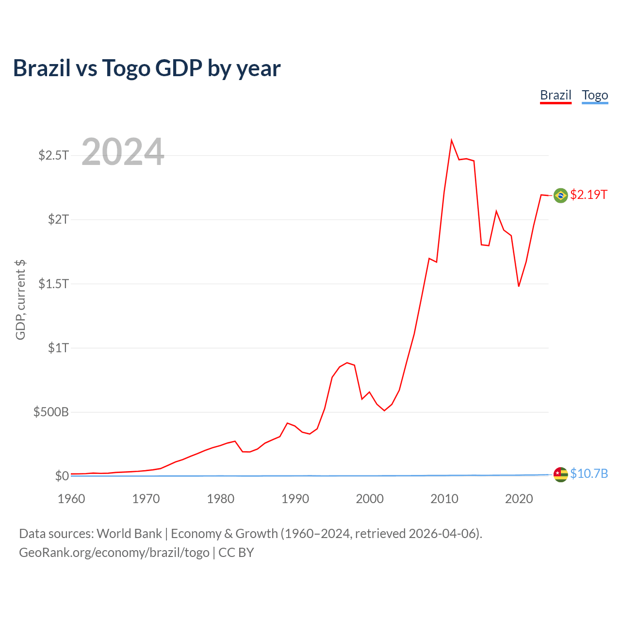 Brazil has a GDP of $2.19T compared to $10.7B for Togo, ranking 10/197 and 154/197 by economy size, respectively.