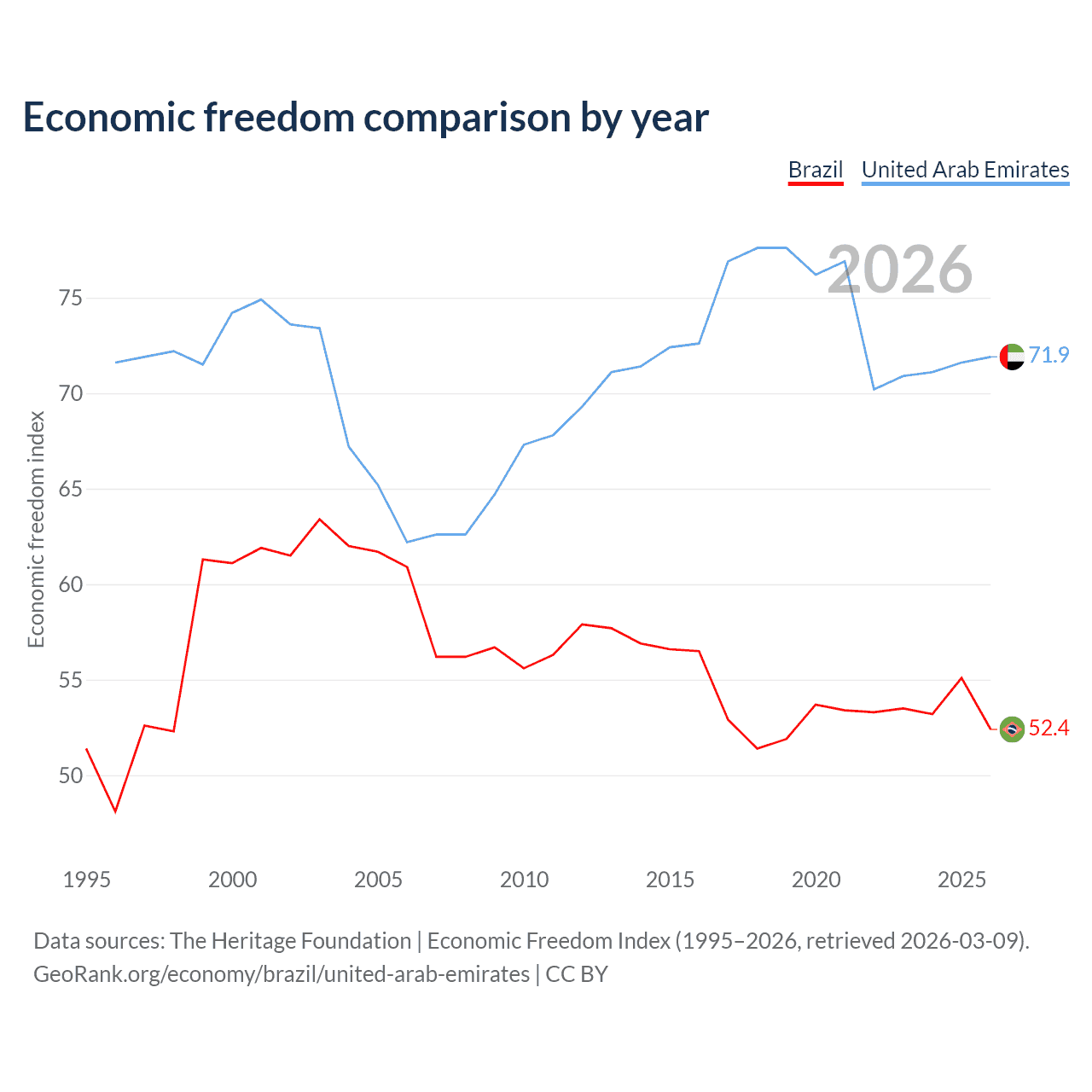The Economic Freedom Index for Brazil is 52.4, ranking 148/197, compared to 71.9 for the United Arab Emirates, ranking 29/197. The chart above displays a comparison of annual changes in economic freedom indexes.