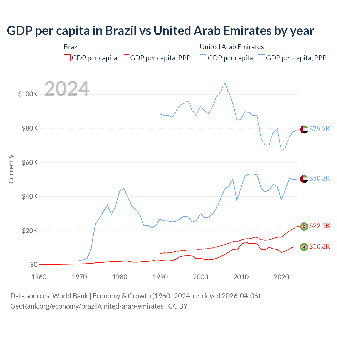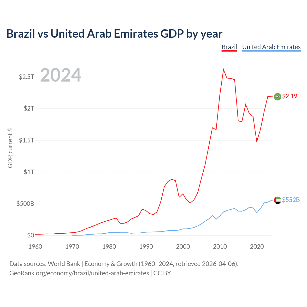 Brazil has a GDP of $2.19T compared to $552B for the United Arab Emirates, ranking 10/197 and 27/197 by economy size, respectively.
