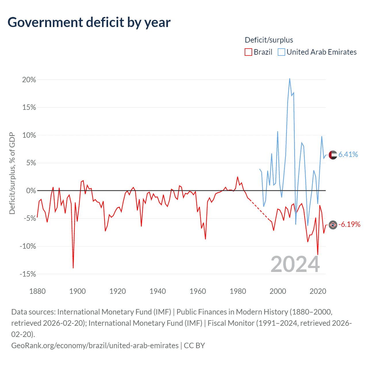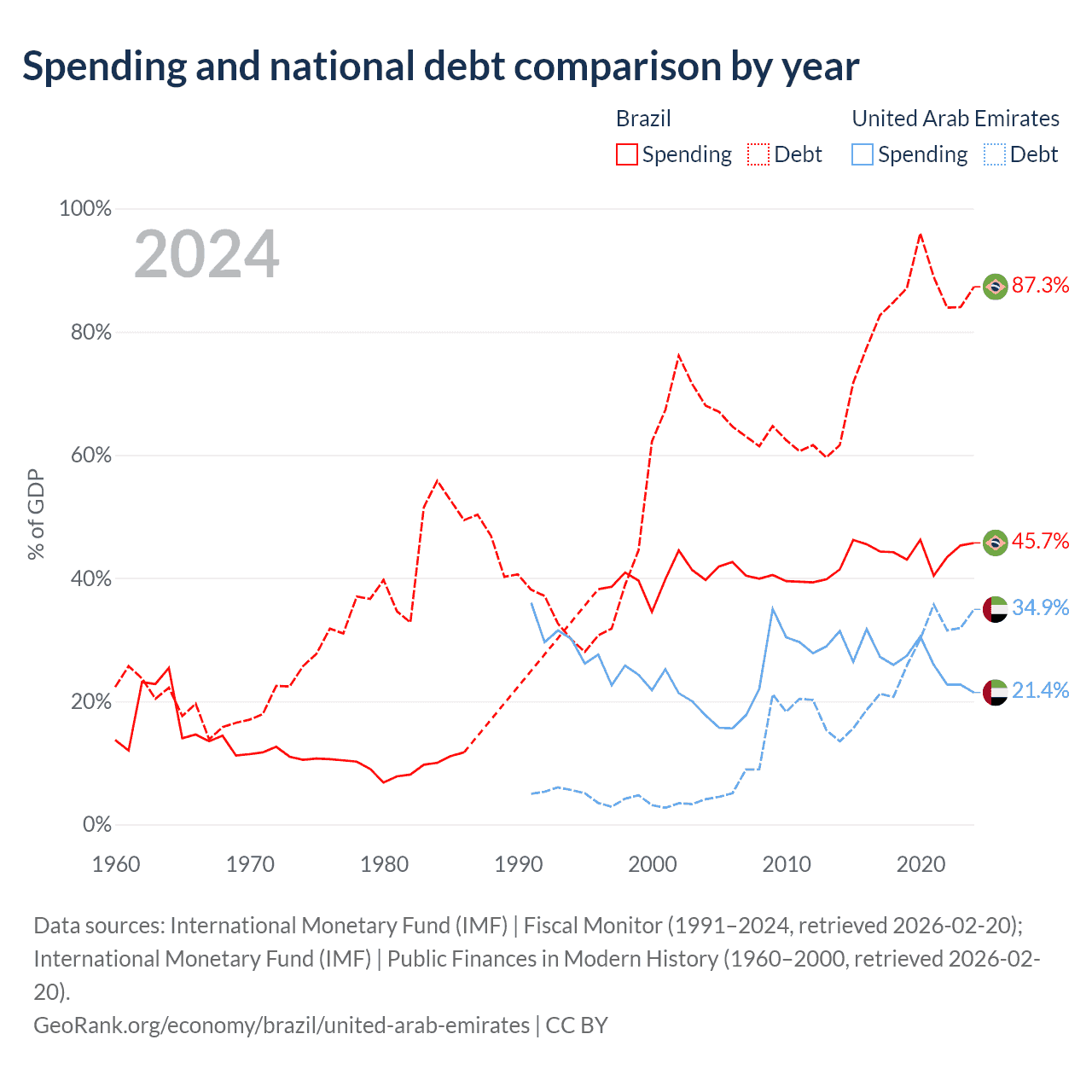 Brazil has $1.91T in government debt (87.3% of GDP), compared to $193B (34.9% of GDP) in the United Arab Emirates.