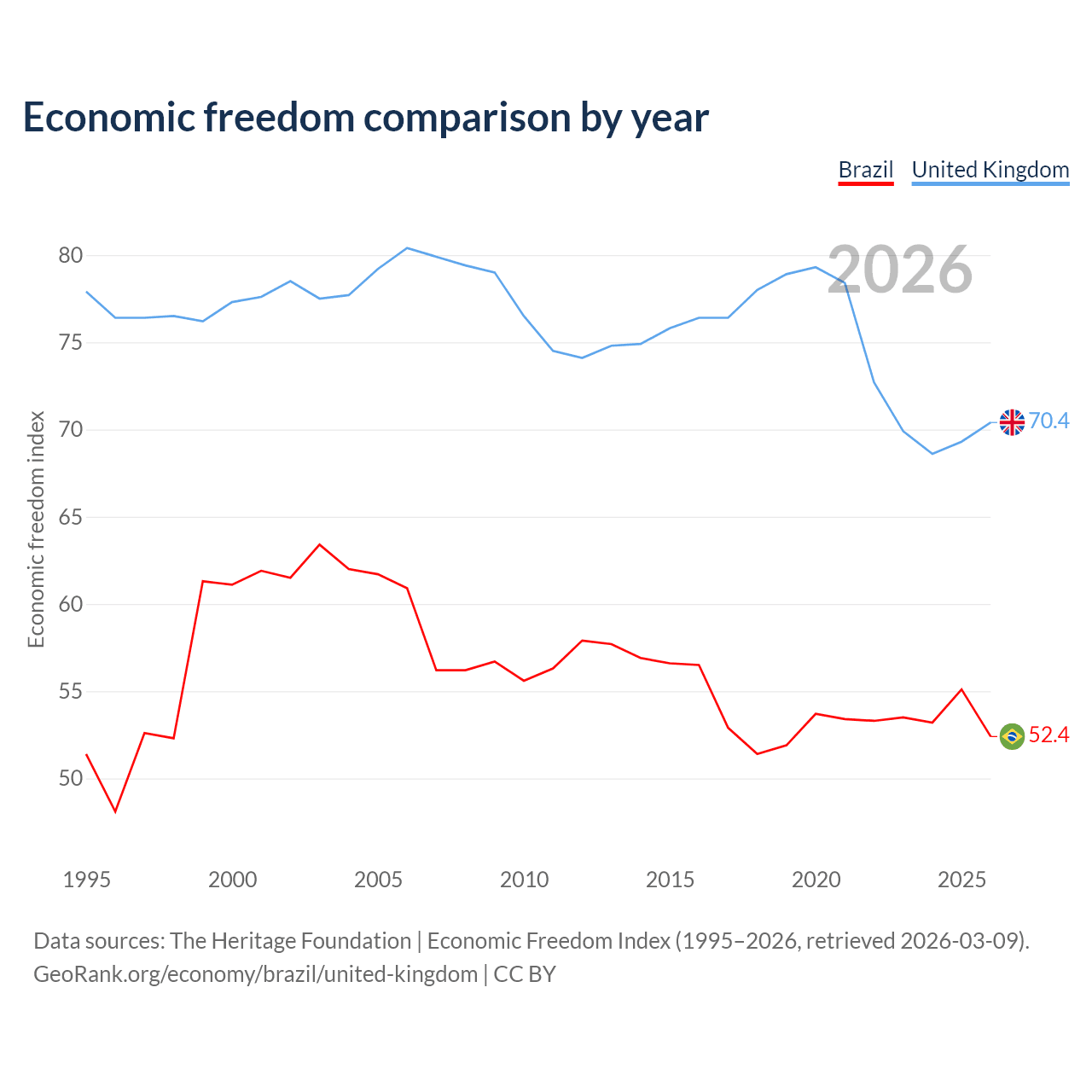 The Economic Freedom Index for Brazil is 52.4, ranking 148/197, compared to 70.4 for the United Kingdom, ranking 35/197. The chart above displays a comparison of annual changes in economic freedom indexes.