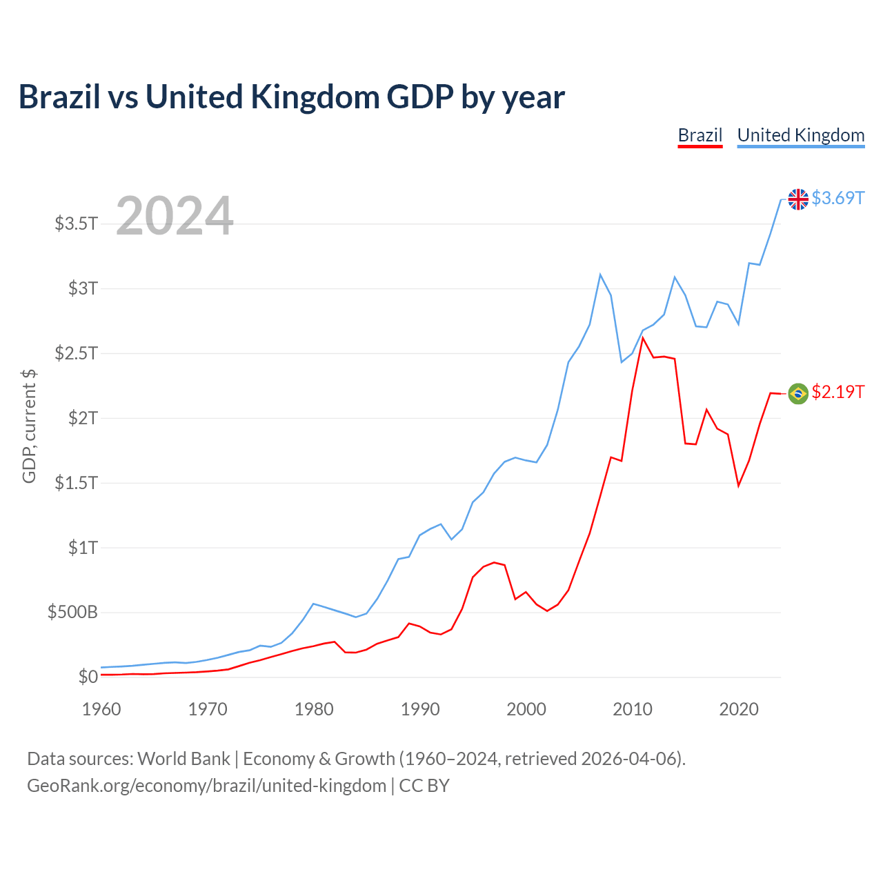 Brazil has a GDP of $2.19T compared to $3.69T for the United Kingdom, ranking 10/197 and 6/197 by economy size, respectively.