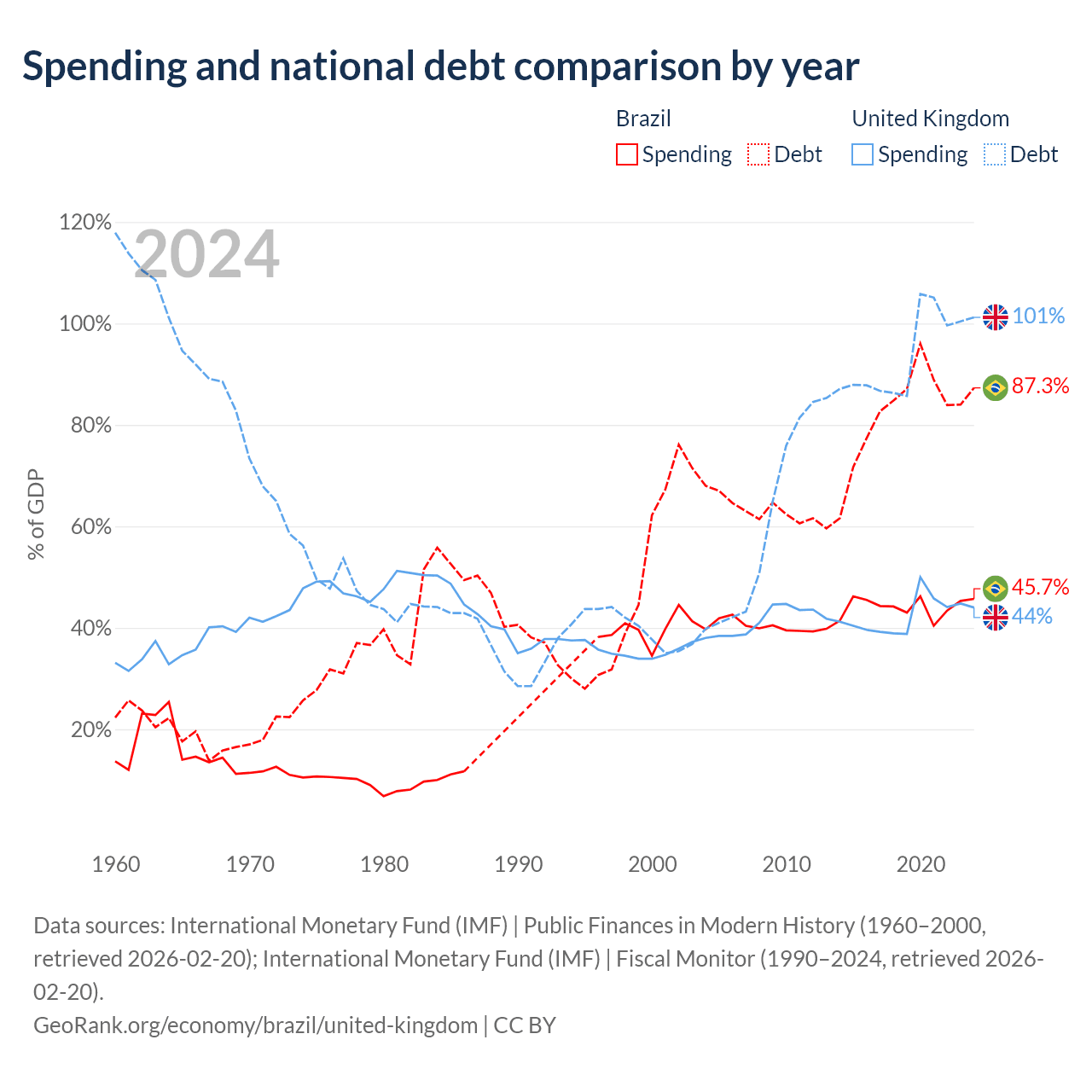 Brazil has $1.91T in government debt (87.3% of GDP), compared to $3.73T (101.2% of GDP) in the United Kingdom.