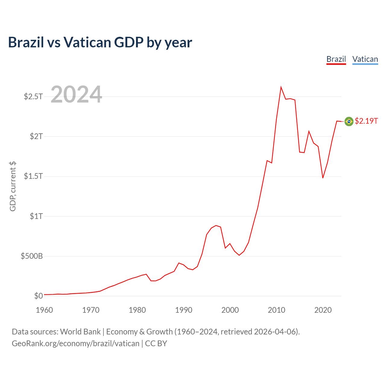 Brazil has a GDP of $2.19T compared to $19.8M for the Vatican, ranking 10/197 and 197/197 by economy size, respectively.
