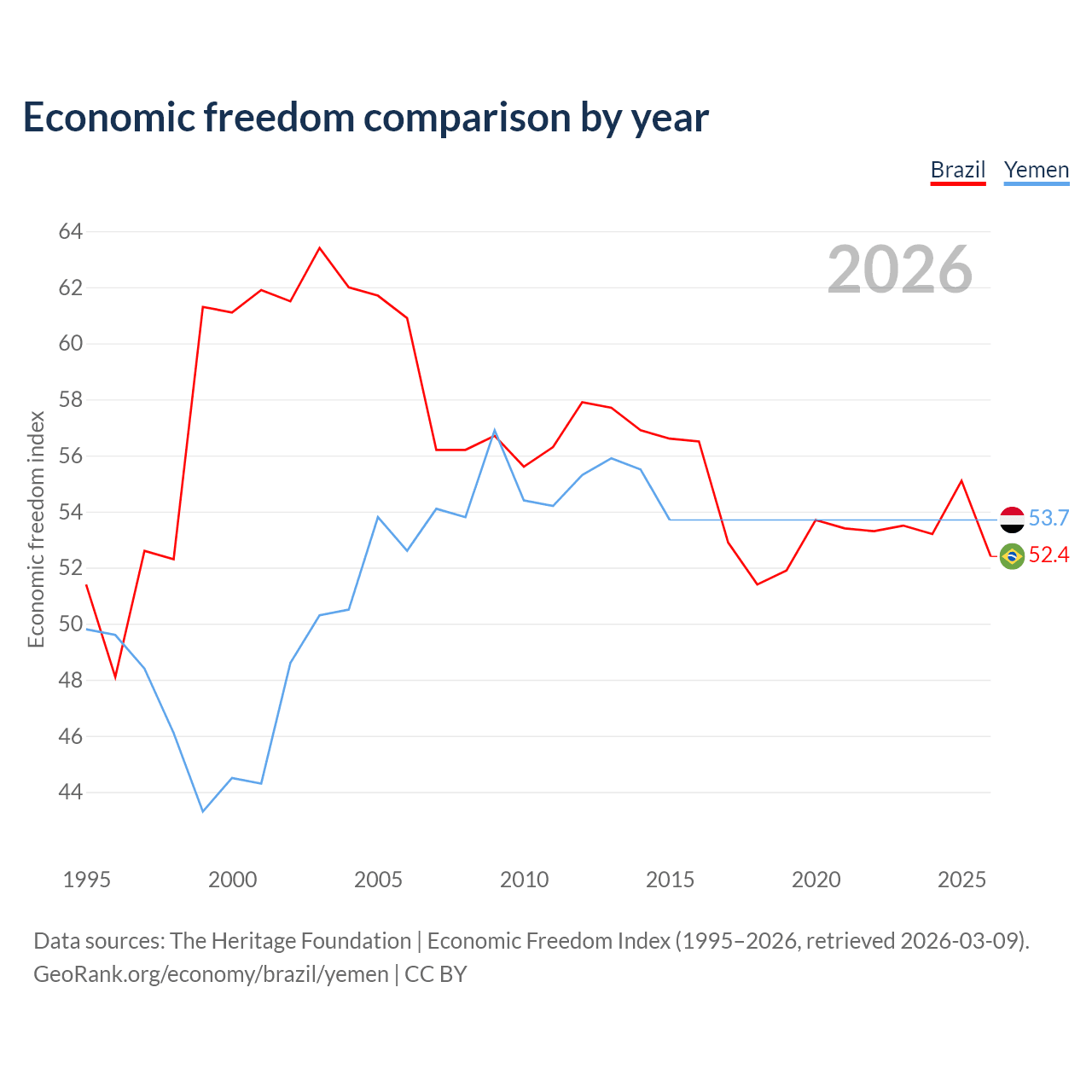 The Economic Freedom Index for Brazil is 52.4, ranking 148/197, compared to 53.7 for Yemen, ranking 138/197. The chart above displays a comparison of annual changes in economic freedom indexes.