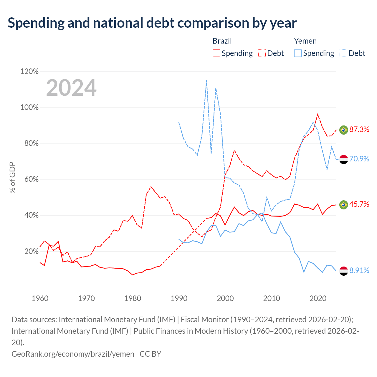 Brazil has $1.91T in government debt (87.3% of GDP), compared to $18.8B (70.9% of GDP) in Yemen.