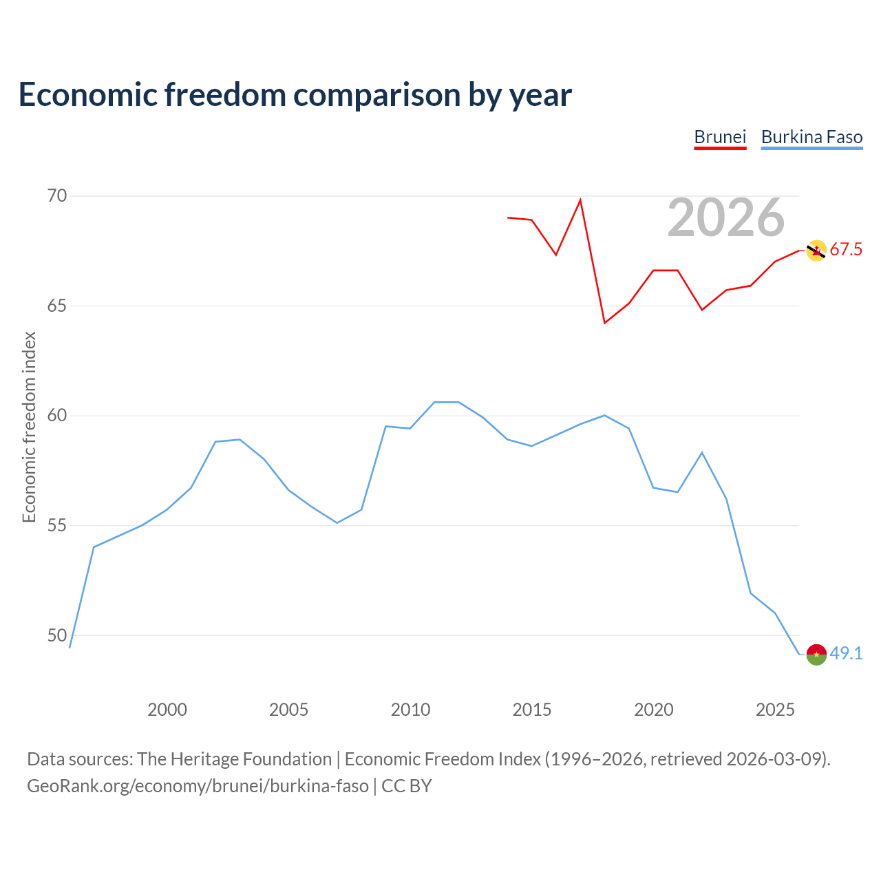 The Economic Freedom Index for Brunei is 67.5, ranking 55/197, compared to 49.1 for Burkina Faso, ranking 167/197. The chart above displays a comparison of annual changes in economic freedom indexes.