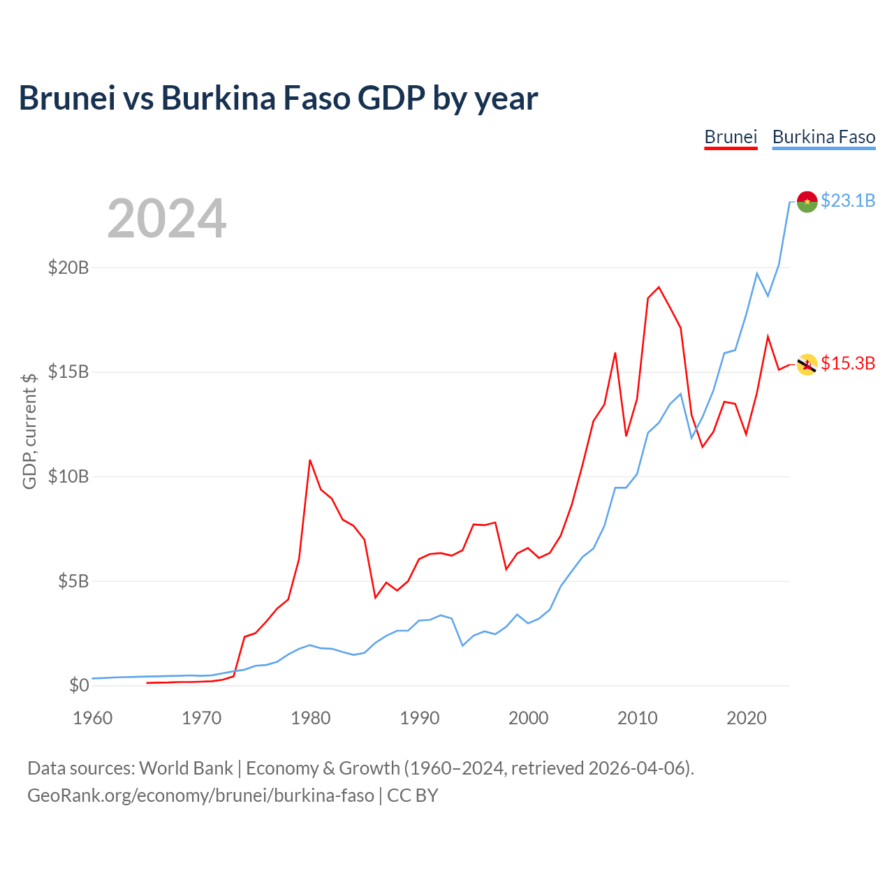 Brunei has a GDP of $15.3B compared to $23.1B for Burkina Faso, ranking 142/197 and 122/197 by economy size, respectively.