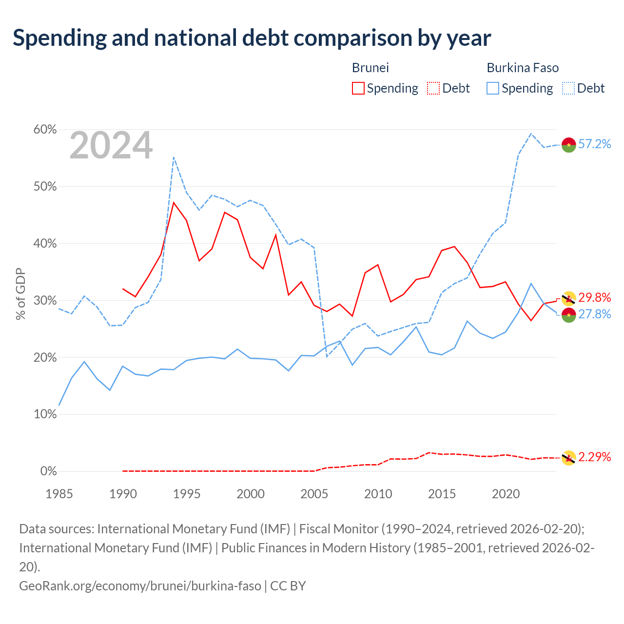 Brunei has $351M in government debt (2.29% of GDP), compared to $13.2B (57.2% of GDP) in Burkina Faso.