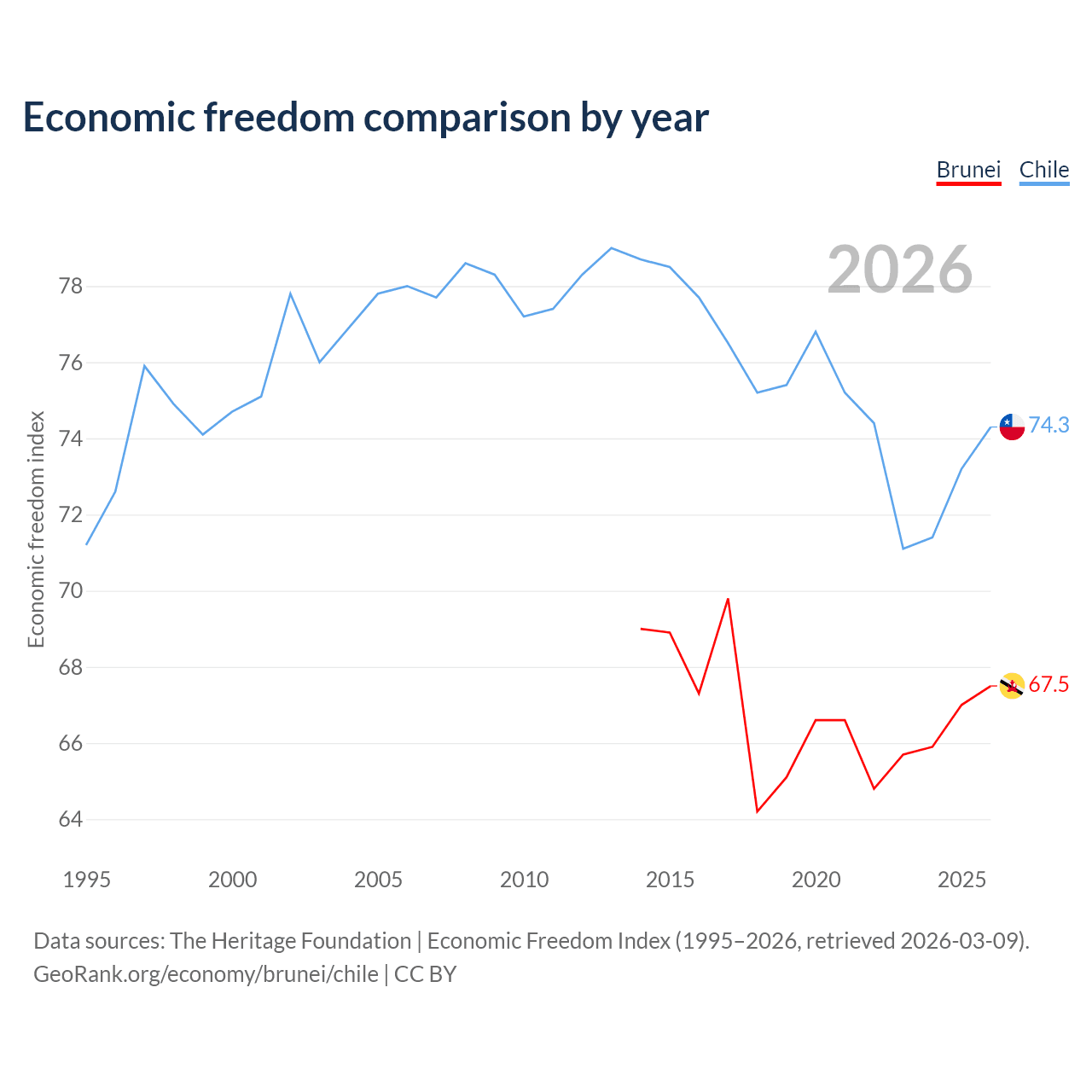 The Economic Freedom Index for Brunei is 67.5, ranking 55/197, compared to 74.3 for Chile, ranking 20/197. The chart above displays a comparison of annual changes in economic freedom indexes.