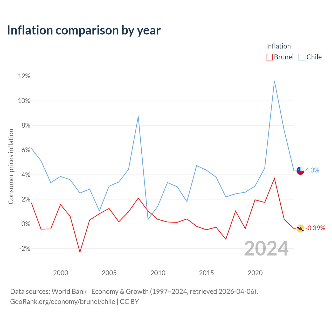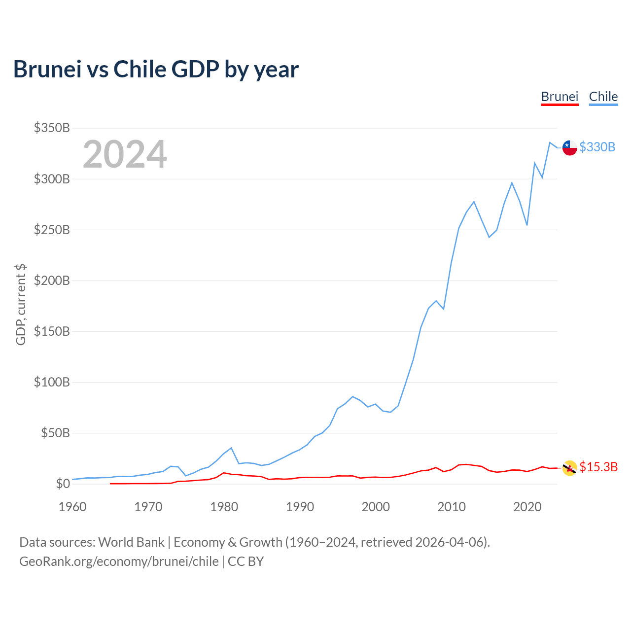 Brunei has a GDP of $15.3B compared to $330B for Chile, ranking 142/197 and 45/197 by economy size, respectively.