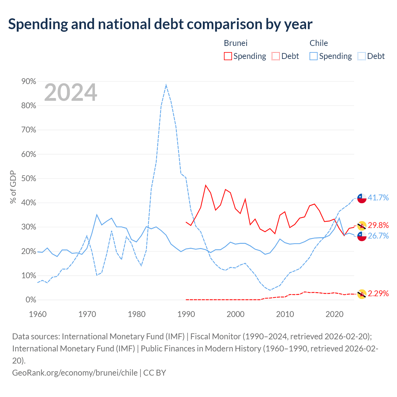 Brunei has $351M in government debt (2.29% of GDP), compared to $138B (41.7% of GDP) in Chile.