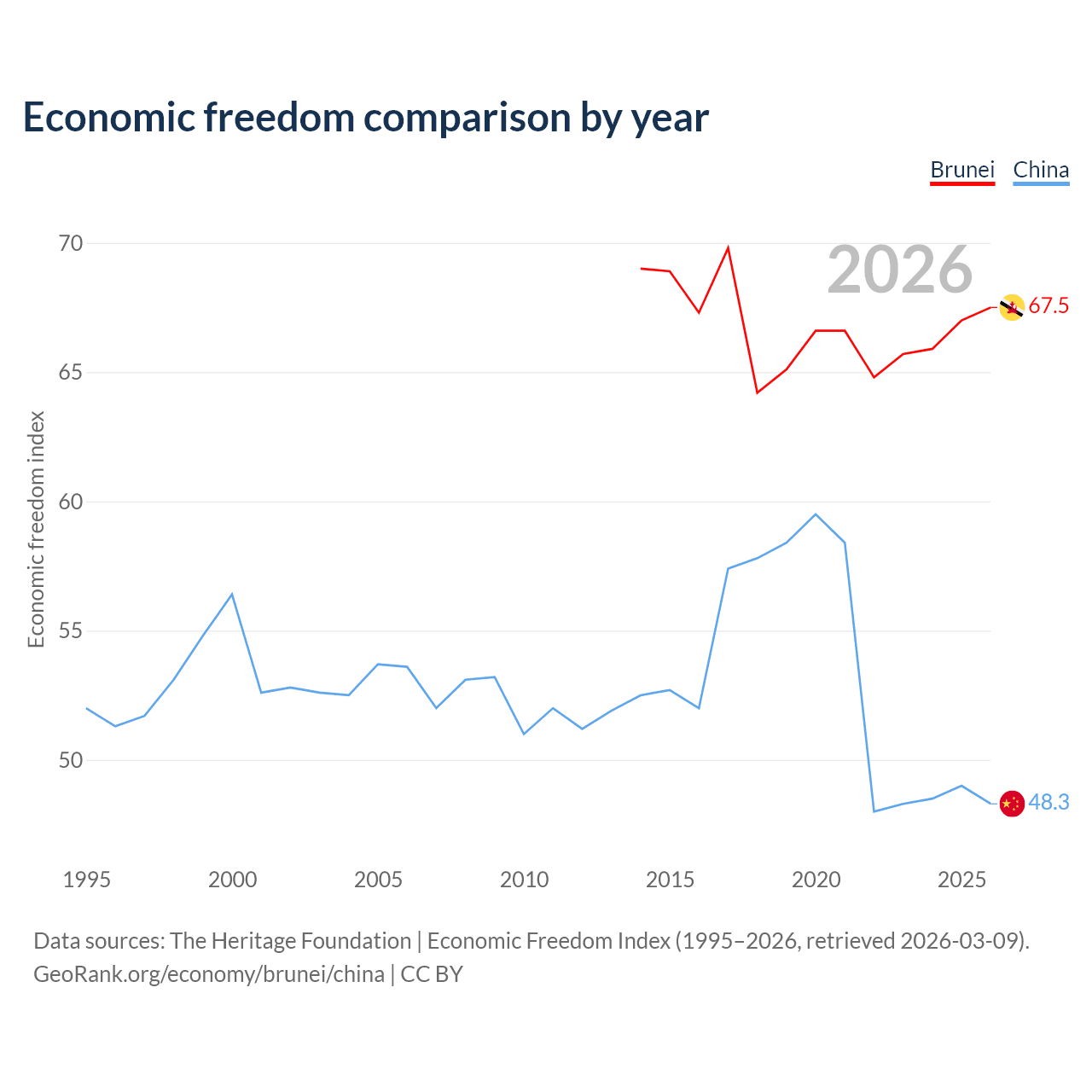 The Economic Freedom Index for Brunei is 67.5, ranking 55/197, compared to 48.3 for China, ranking 170/197. The chart above displays a comparison of annual changes in economic freedom indexes.