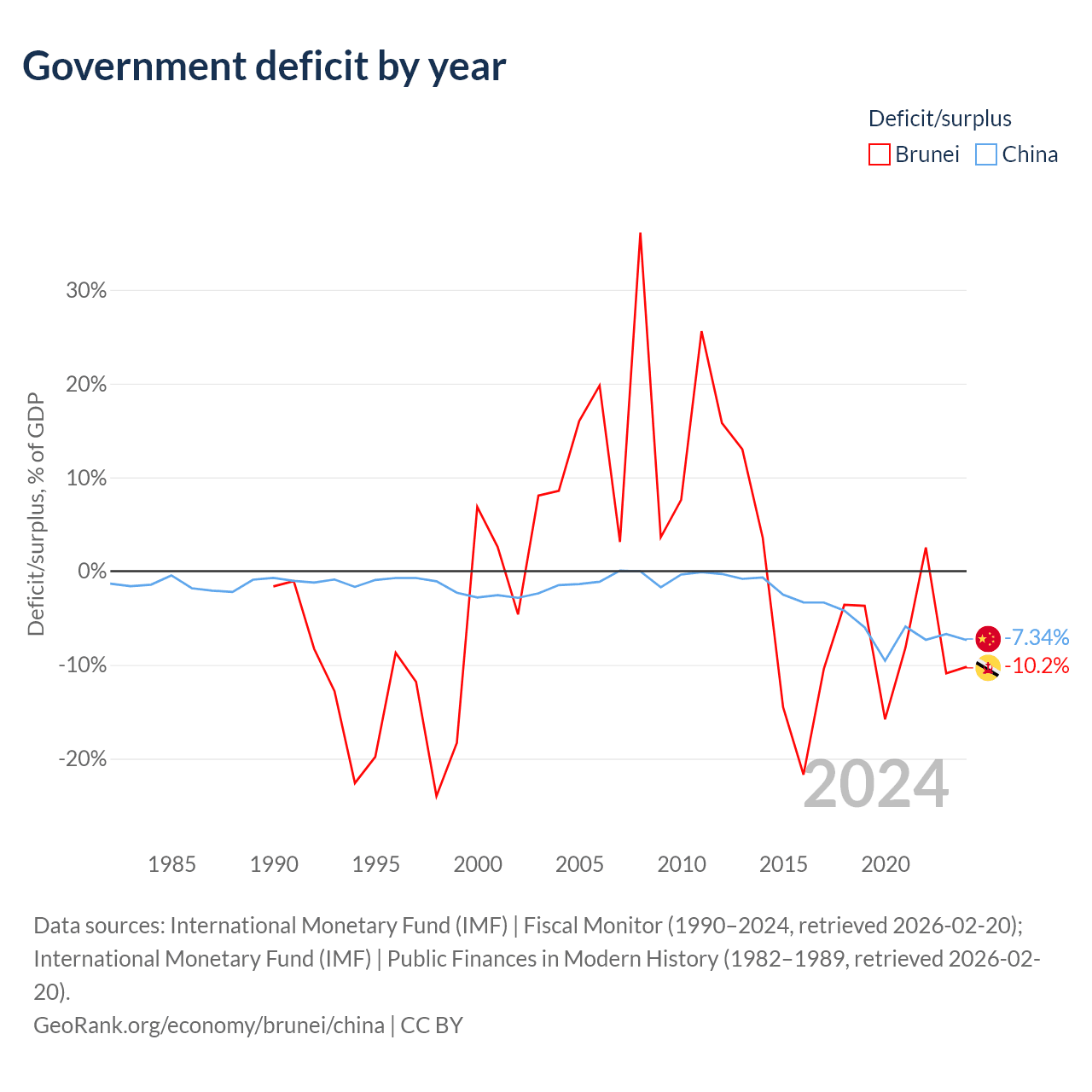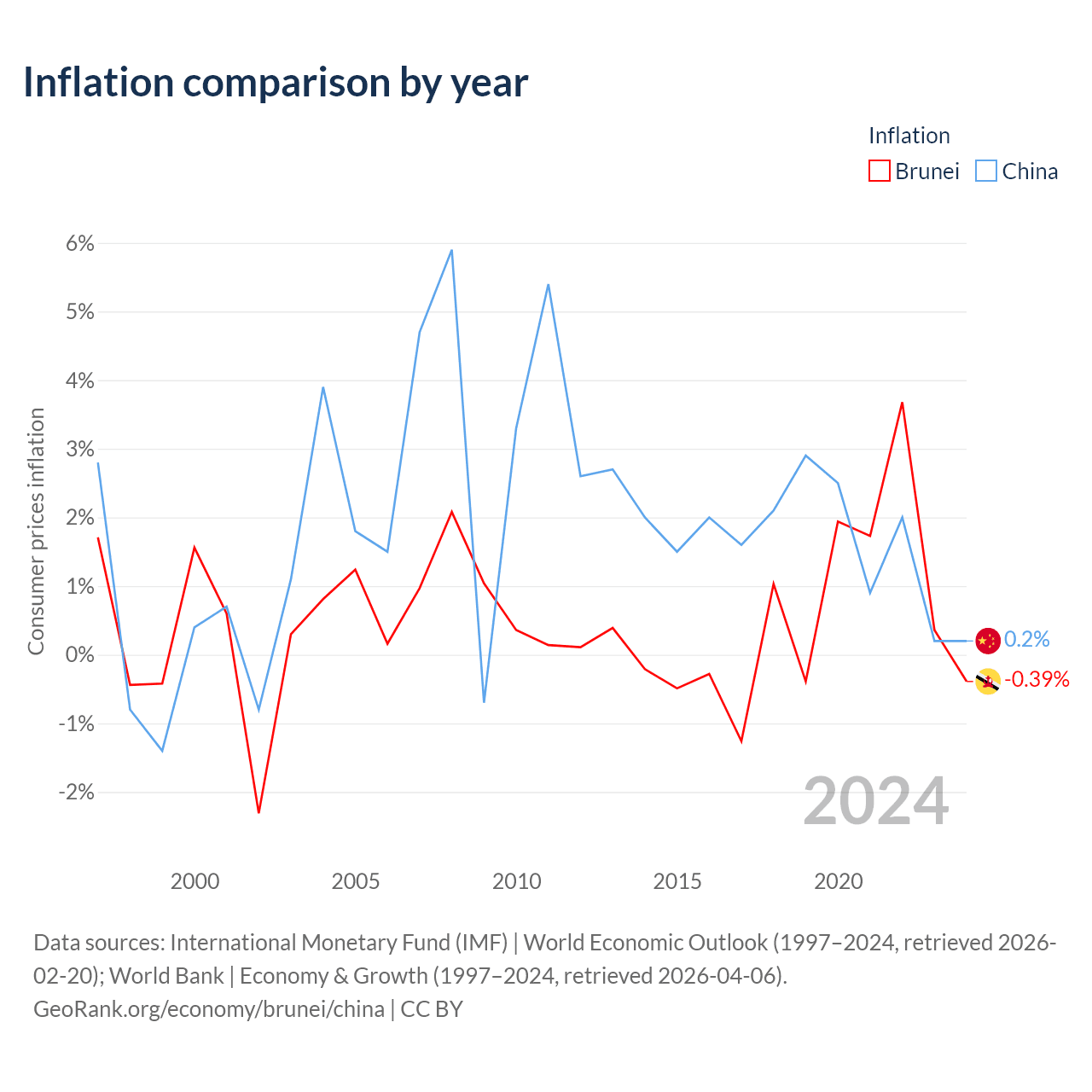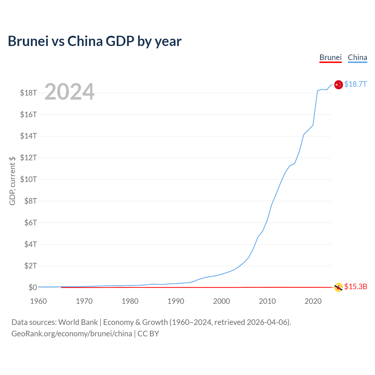 Brunei has a GDP of $15.3B compared to $18.7T for China, ranking 142/197 and 2/197 by economy size, respectively.