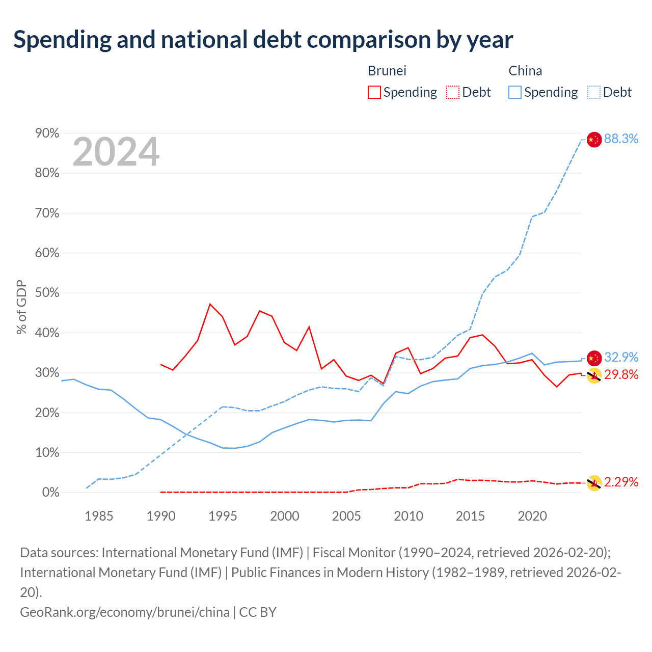 Brunei has $351M in government debt (2.29% of GDP), compared to $16.6T (88.3% of GDP) in China.