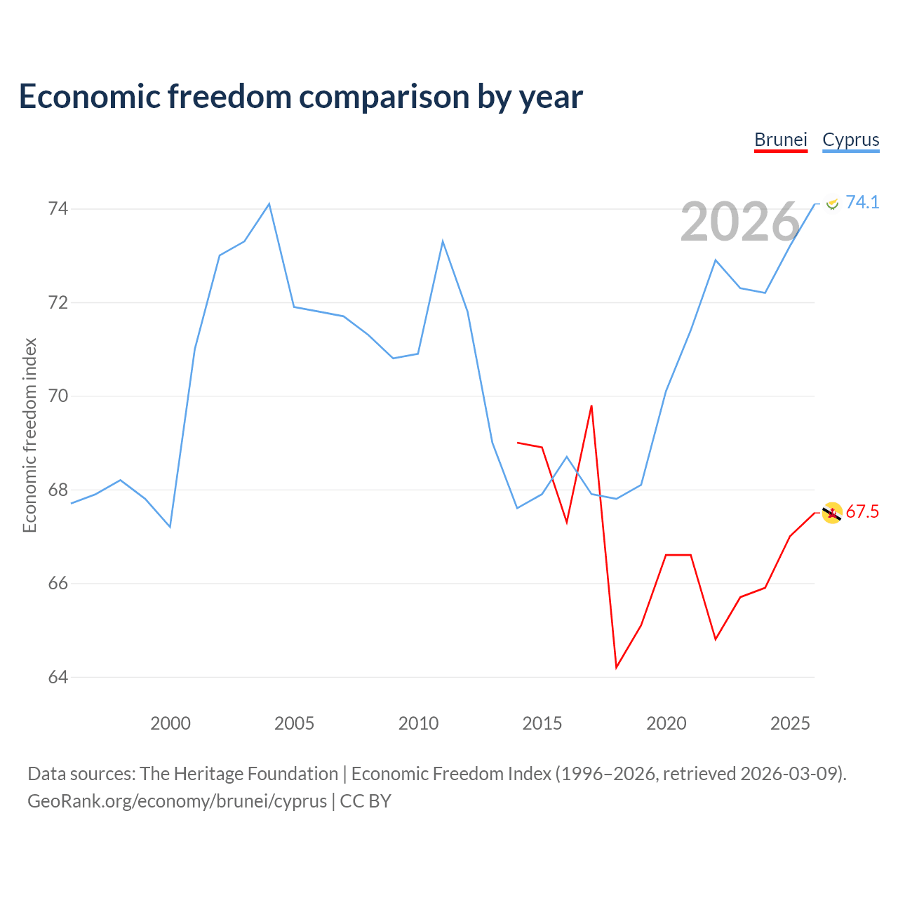 The Economic Freedom Index for Brunei is 67.5, ranking 55/197, compared to 74.1 for Cyprus, ranking 21/197. The chart above displays a comparison of annual changes in economic freedom indexes.