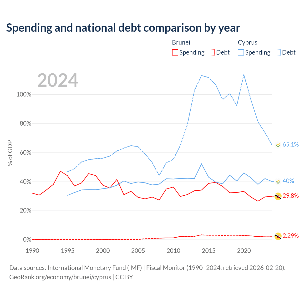 Brunei has $351M in government debt (2.29% of GDP), compared to $24.5B (65.1% of GDP) in Cyprus.