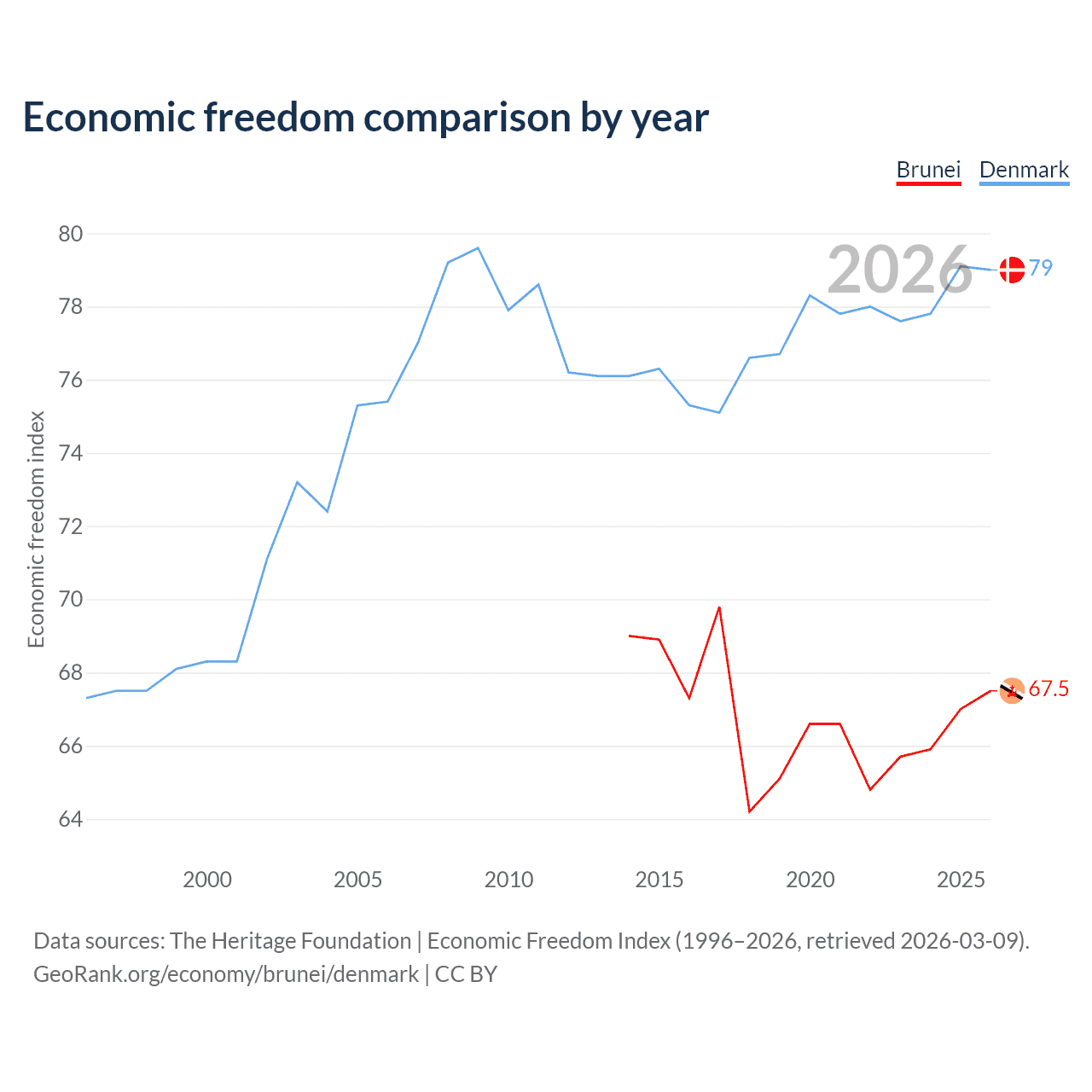 The Economic Freedom Index for Brunei is 67.5, ranking 55/197, compared to 79 for Denmark, ranking 8/197. The chart above displays a comparison of annual changes in economic freedom indexes.