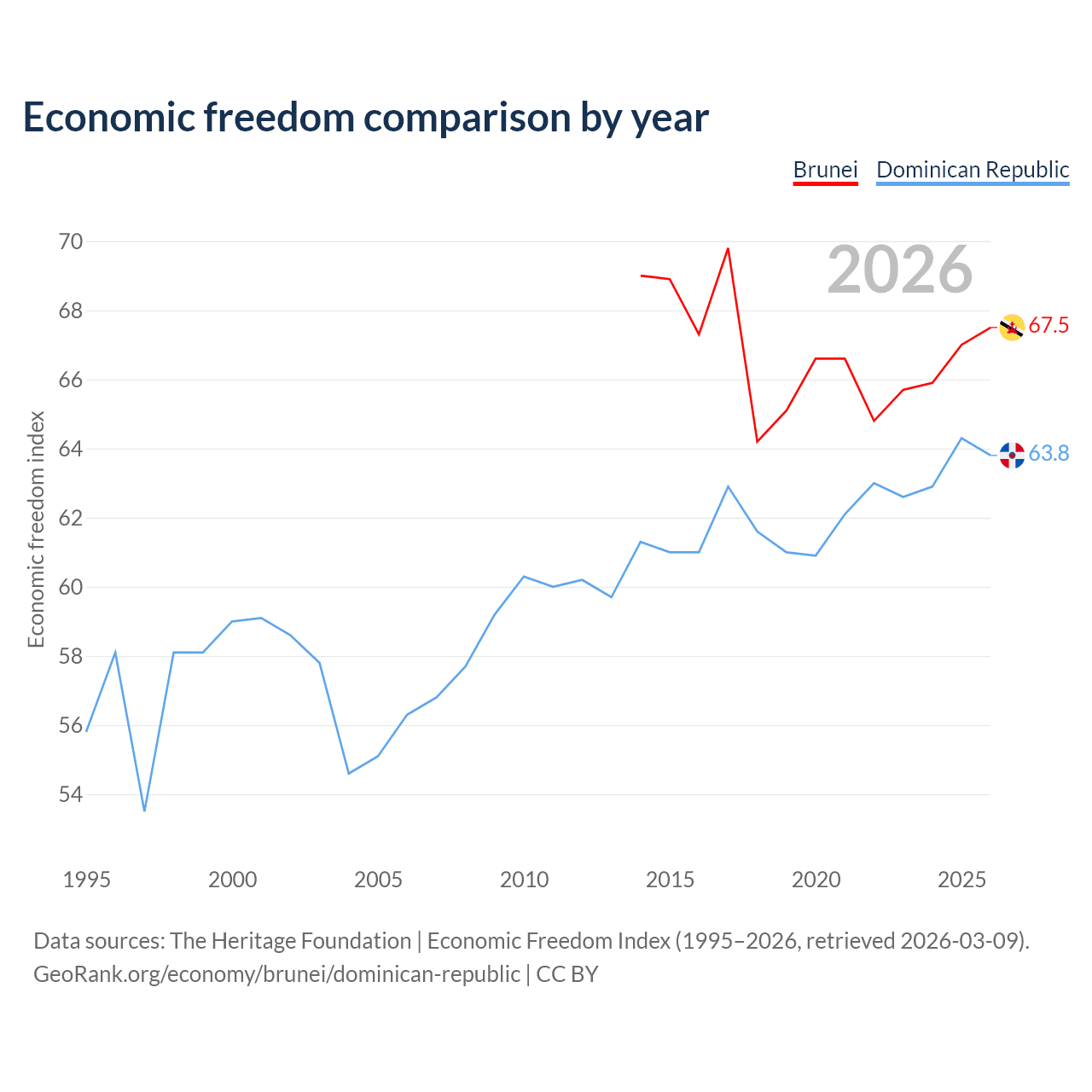 The Economic Freedom Index for Brunei is 67.5, ranking 55/197, compared to 63.8 for the Dominican Republic, ranking 77/197. The chart above displays a comparison of annual changes in economic freedom indexes.