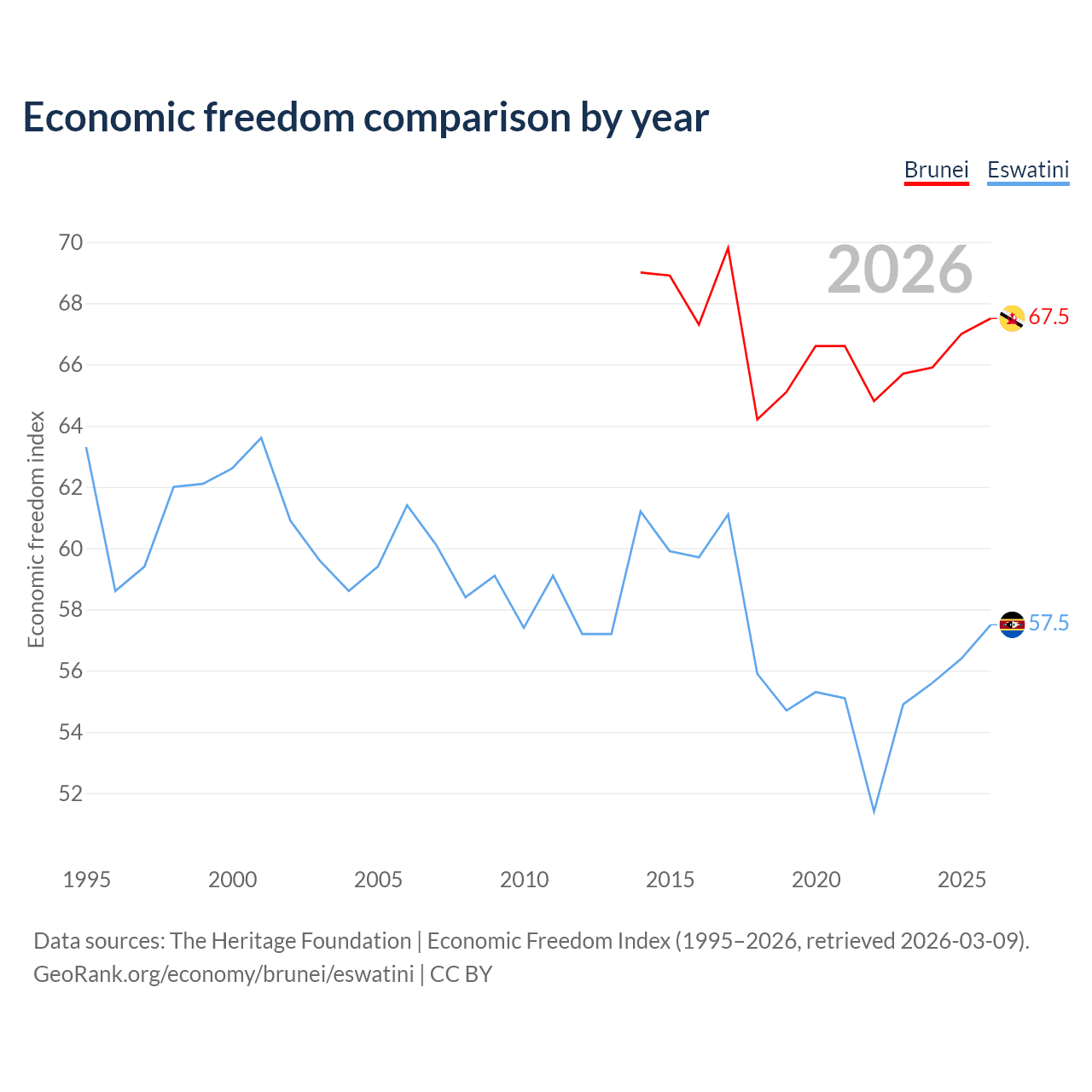 The Economic Freedom Index for Brunei is 67.5, ranking 55/197, compared to 57.5 for Eswatini, ranking 116/197. The chart above displays a comparison of annual changes in economic freedom indexes.