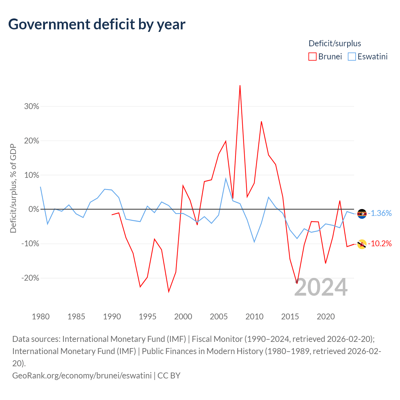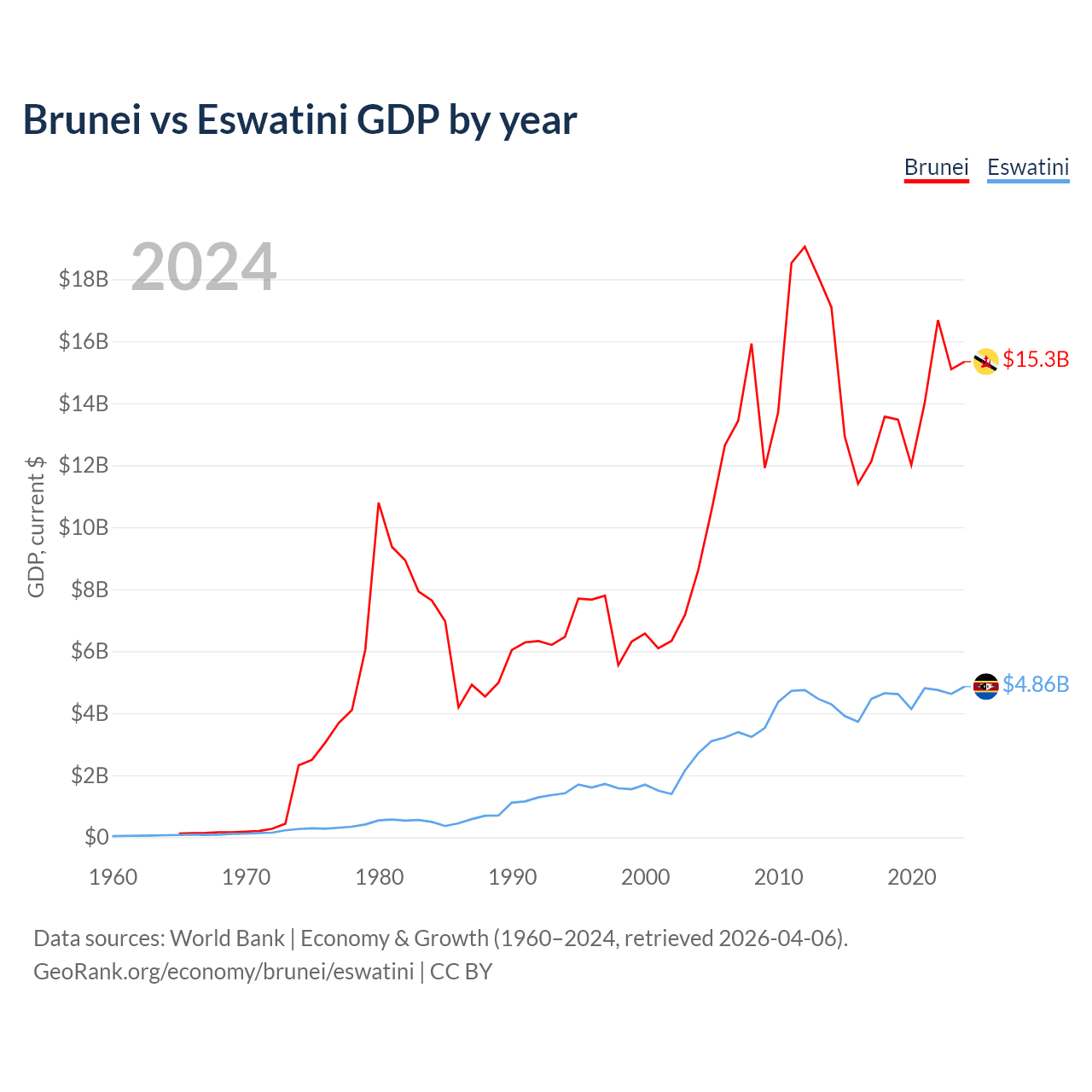 Brunei has a GDP of $15.3B compared to $4.86B for Eswatini, ranking 142/197 and 162/197 by economy size, respectively.