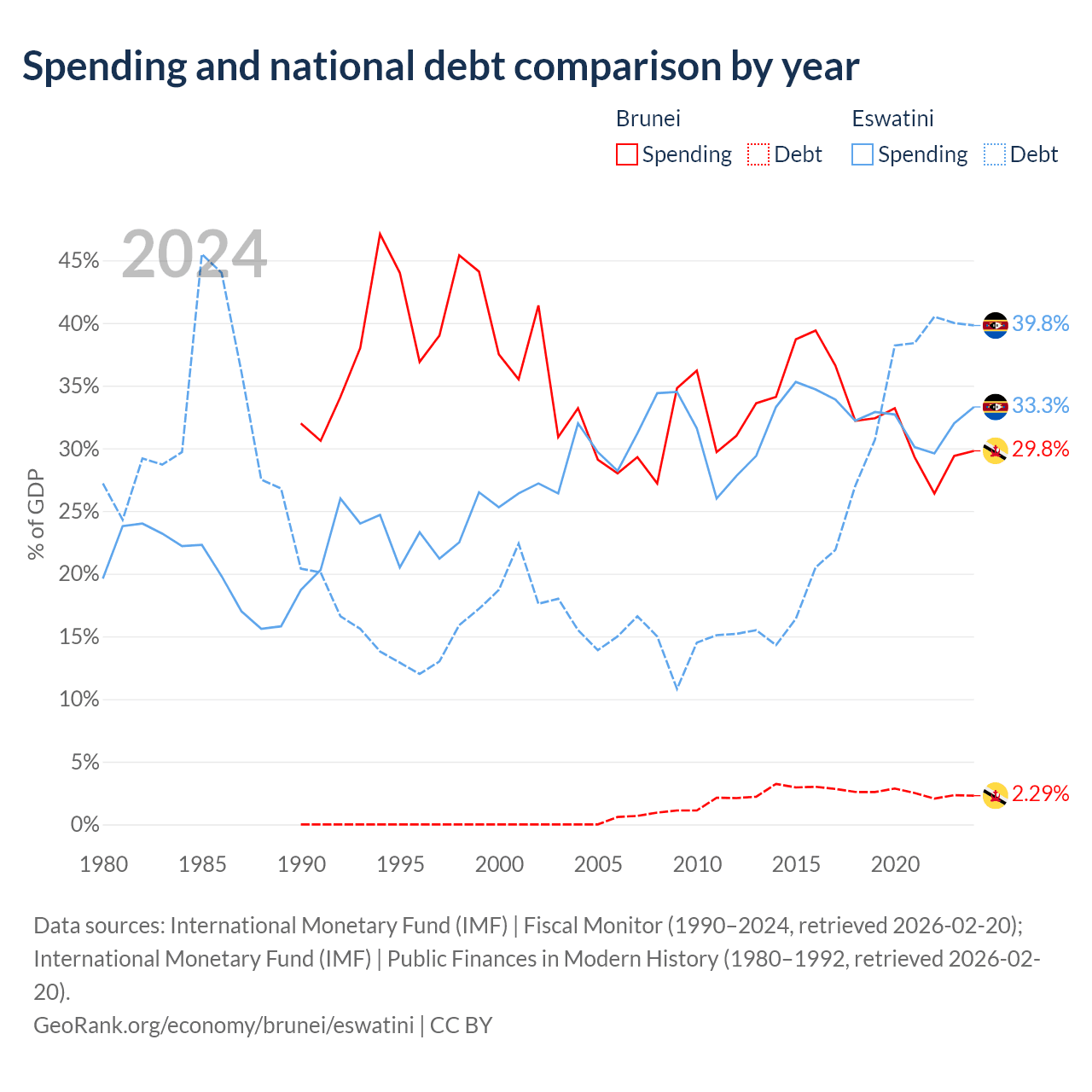 Brunei has $351M in government debt (2.29% of GDP), compared to $1.93B (39.8% of GDP) in Eswatini.