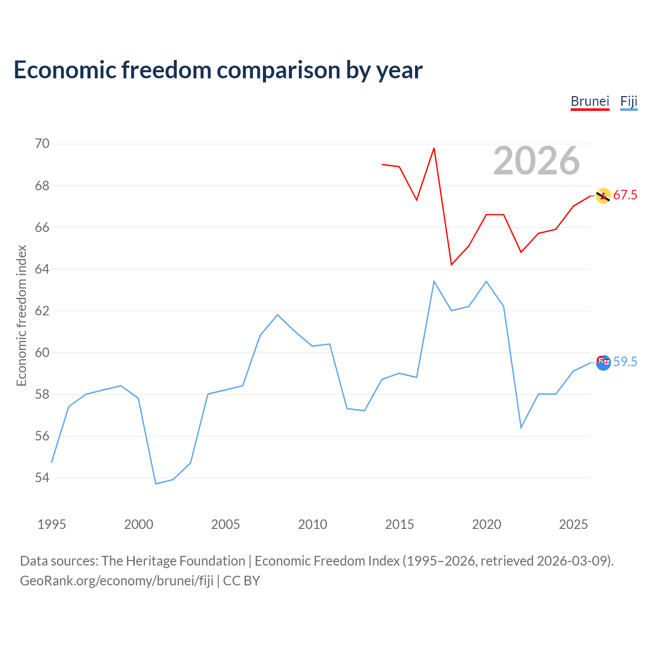 The Economic Freedom Index for Brunei is 67.5, ranking 55/197, compared to 59.5 for Fiji, ranking 103/197. The chart above displays a comparison of annual changes in economic freedom indexes.
