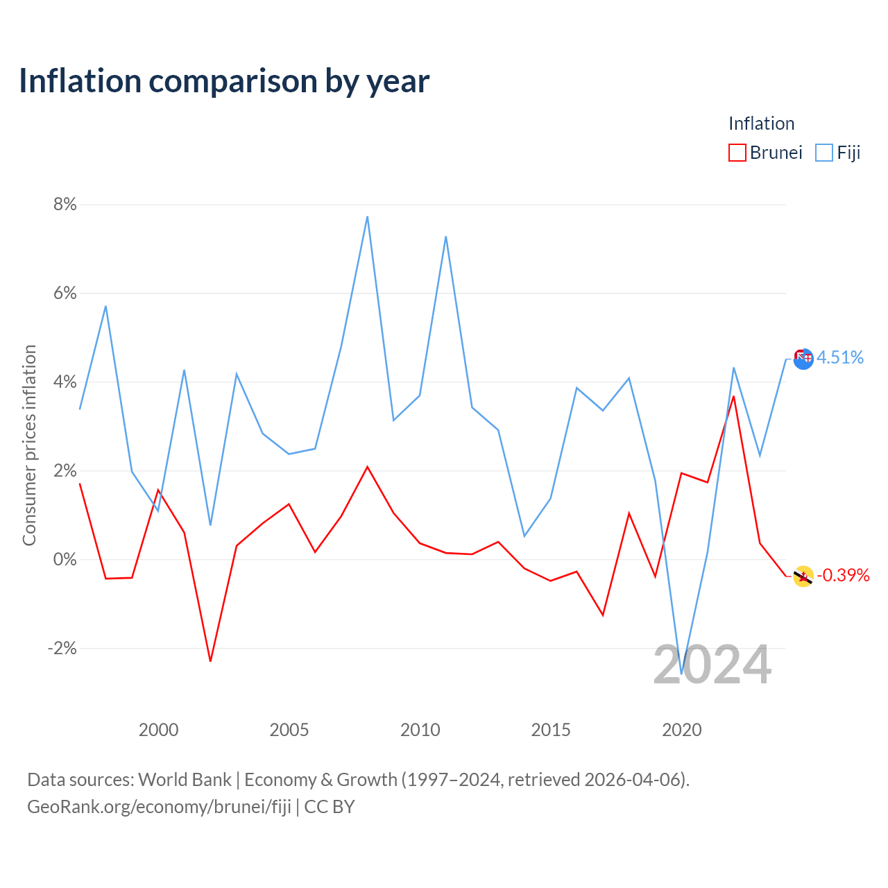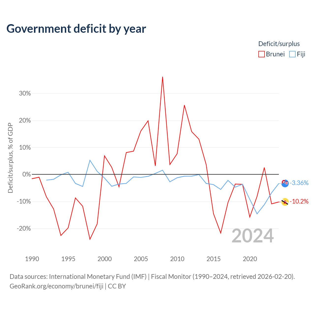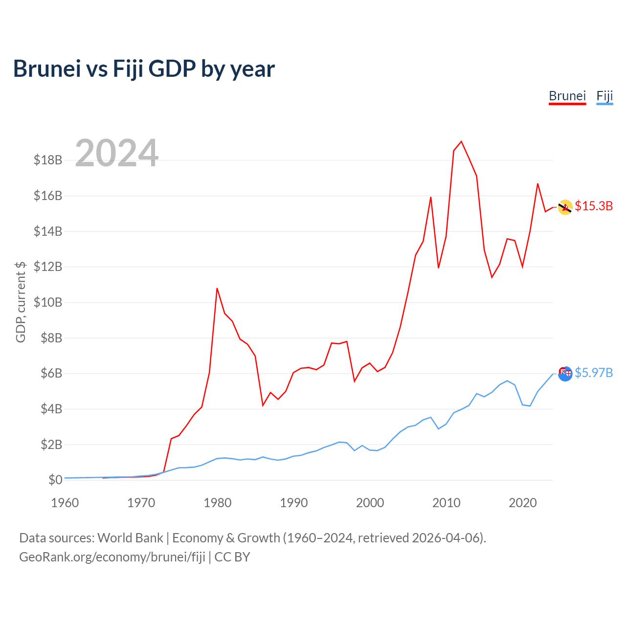 Brunei has a GDP of $15.3B compared to $5.97B for Fiji, ranking 142/197 and 161/197 by economy size, respectively.
