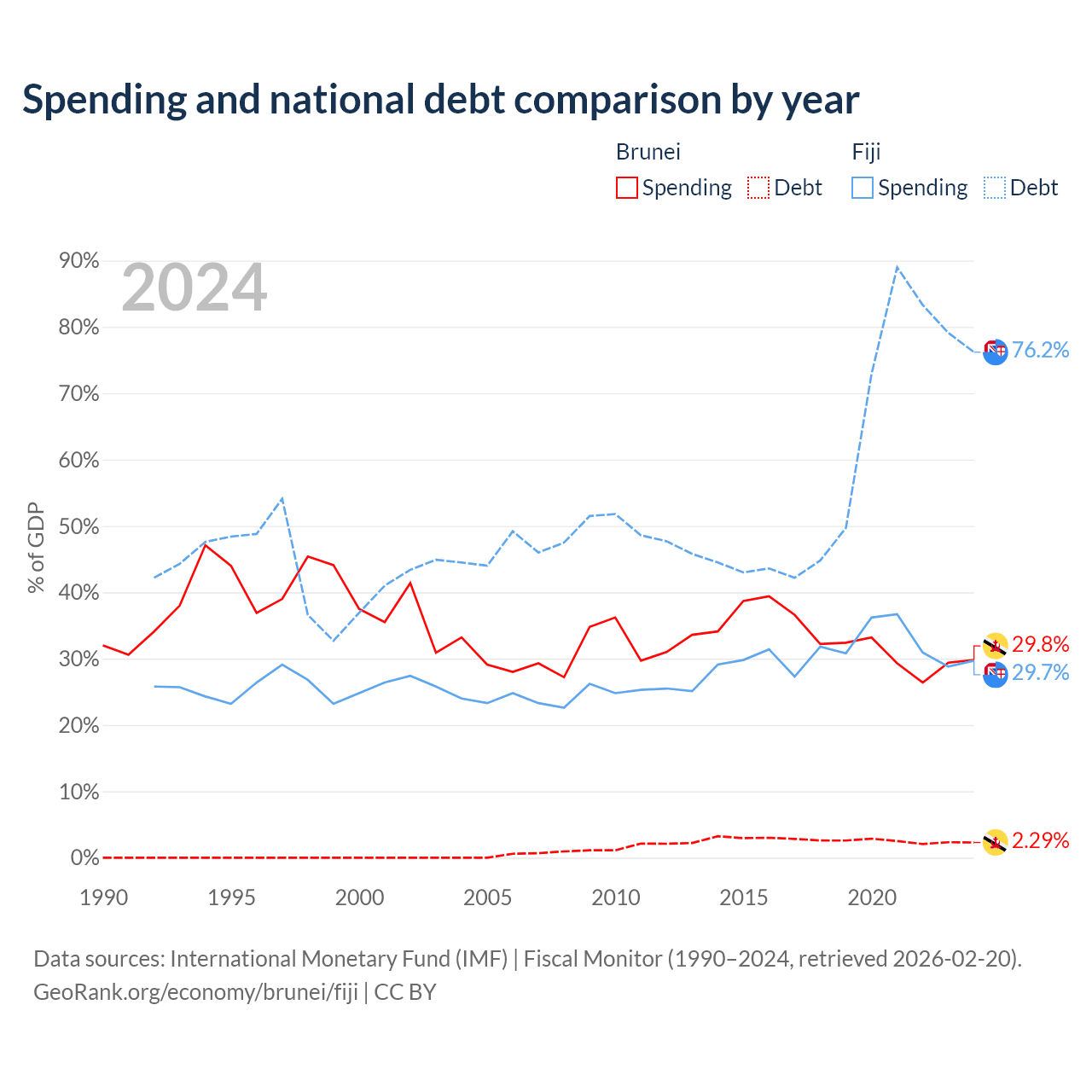 Brunei has $351M in government debt (2.29% of GDP), compared to $4.54B (76.2% of GDP) in Fiji.