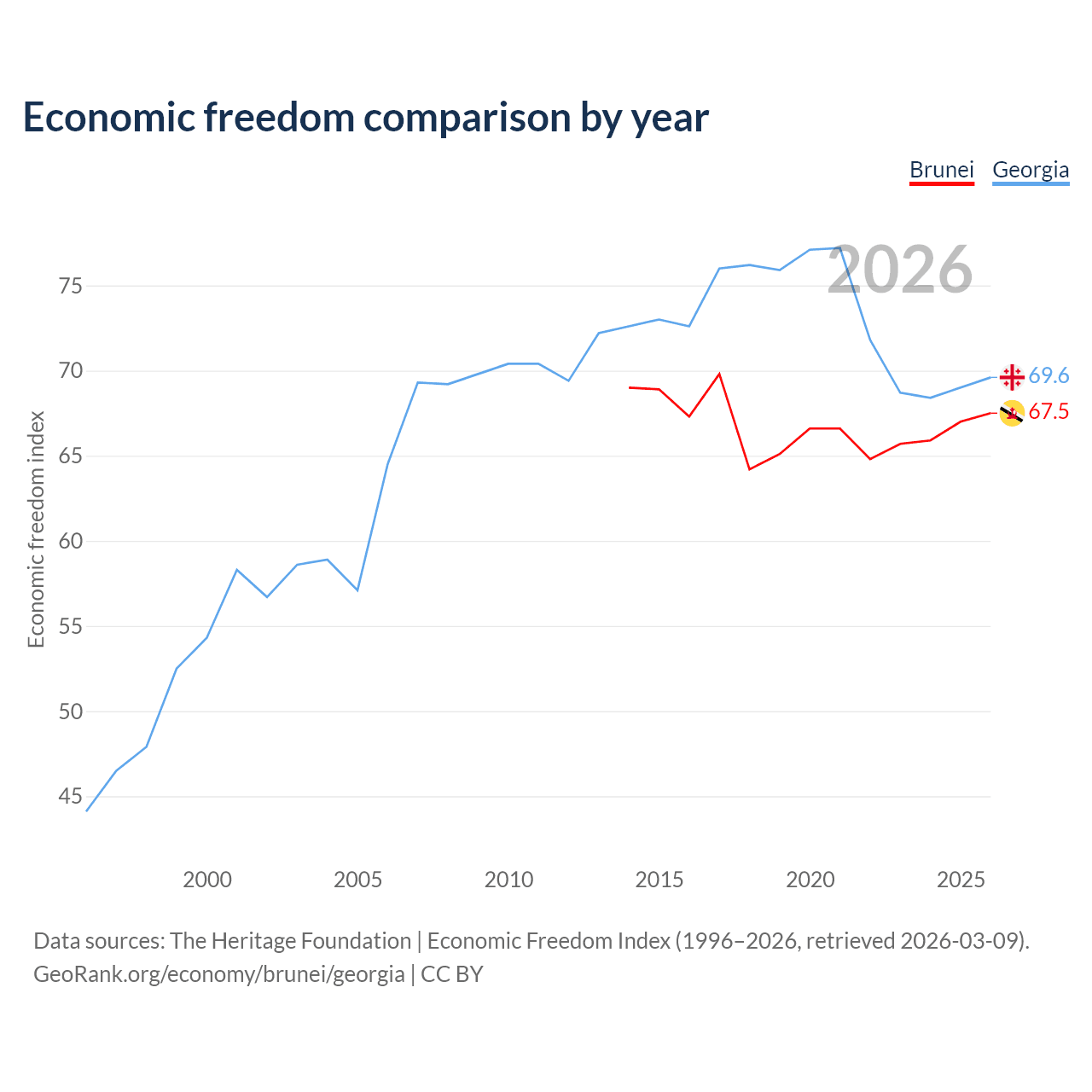 The Economic Freedom Index for Brunei is 67.5, ranking 55/197, compared to 69.6 for Georgia, ranking 41/197. The chart above displays a comparison of annual changes in economic freedom indexes.