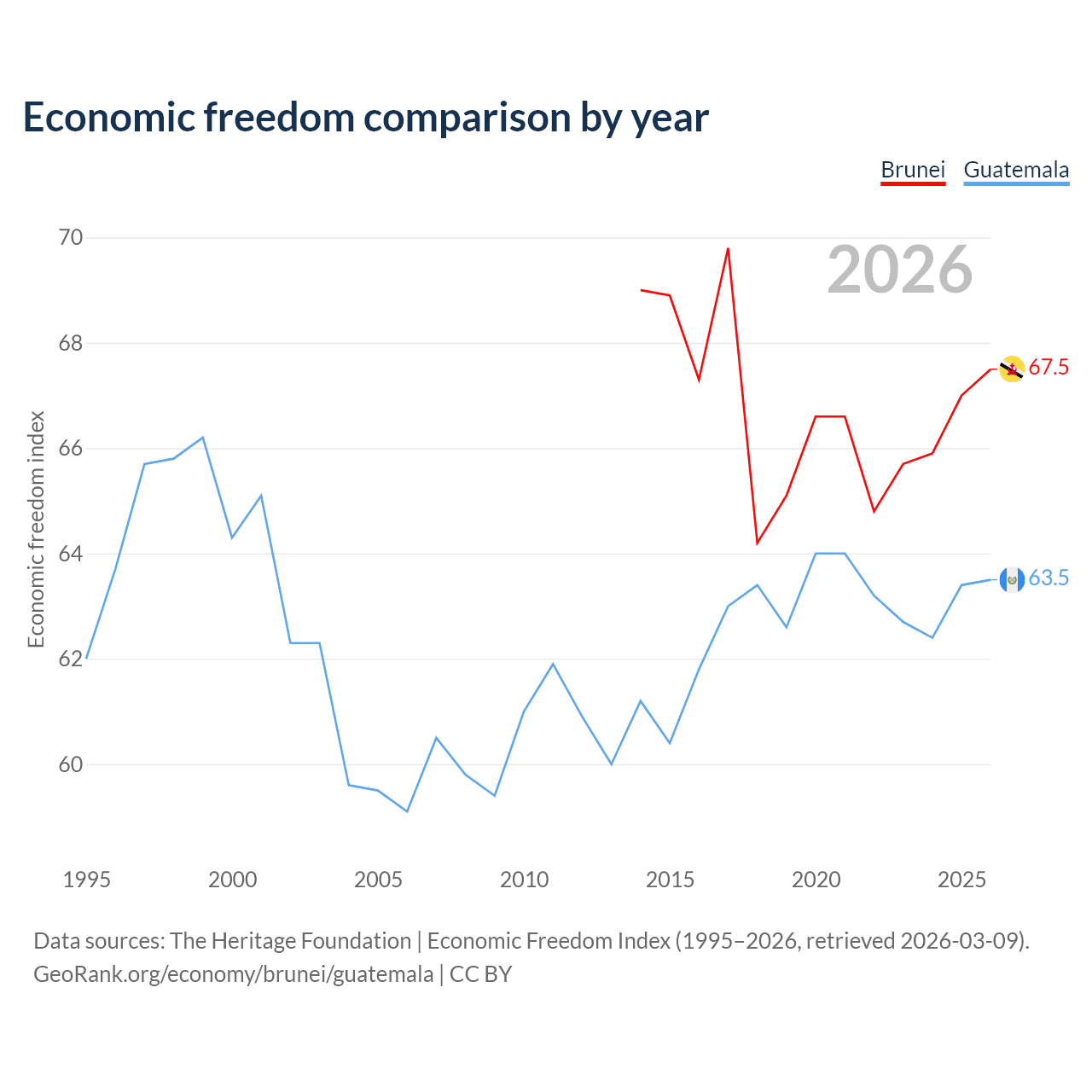 The Economic Freedom Index for Brunei is 67.5, ranking 55/197, compared to 63.5 for Guatemala, ranking 79/197. The chart above displays a comparison of annual changes in economic freedom indexes.