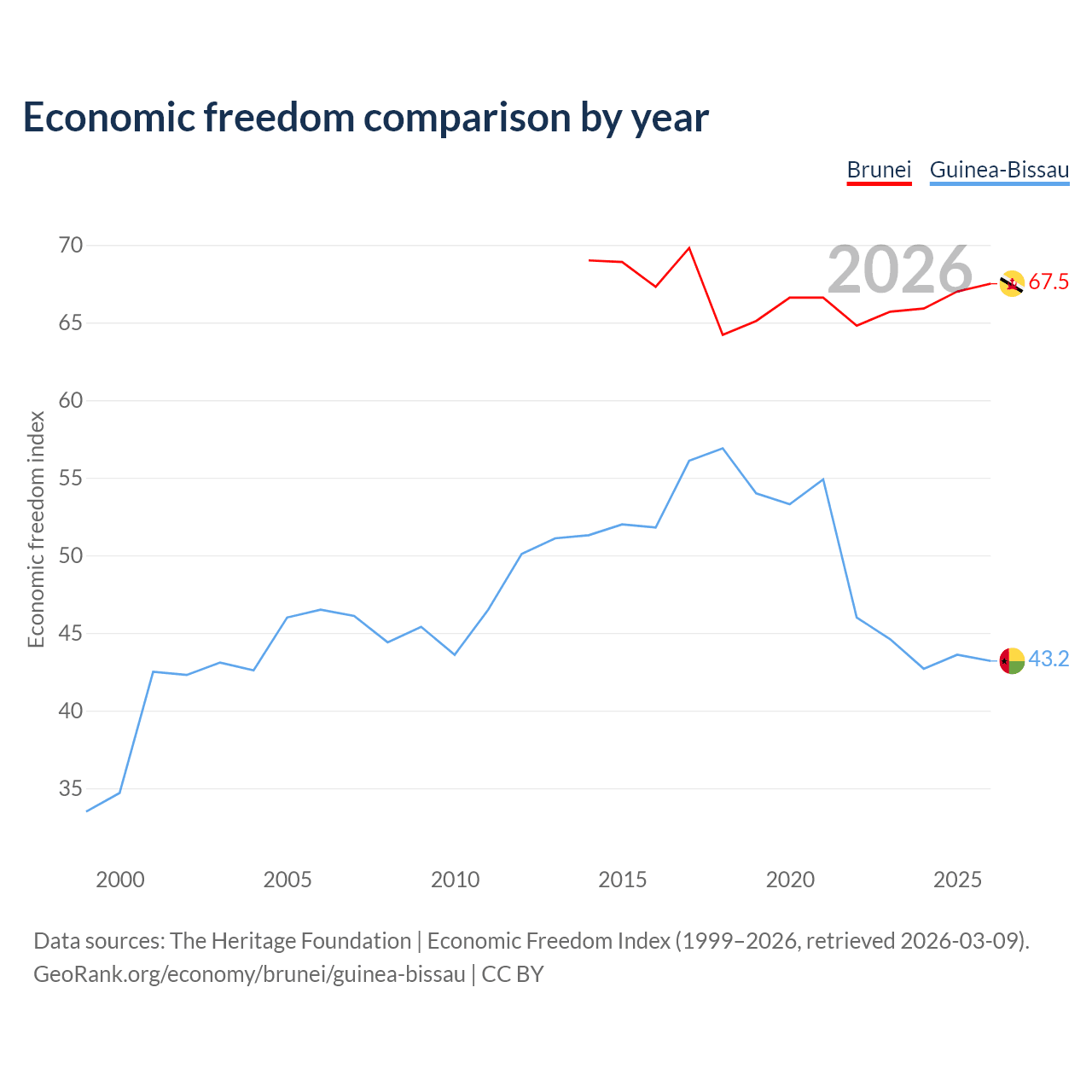 The Economic Freedom Index for Brunei is 67.5, ranking 55/197, compared to 43.2 for Guinea-Bissau, ranking 181/197. The chart above displays a comparison of annual changes in economic freedom indexes.