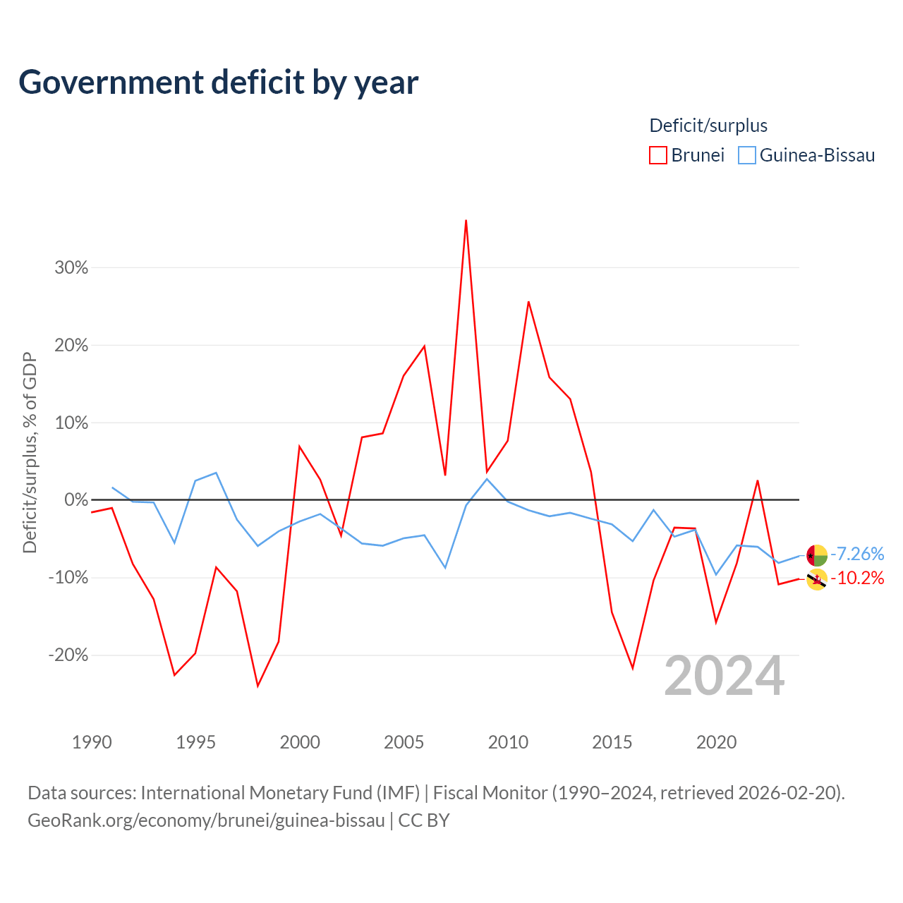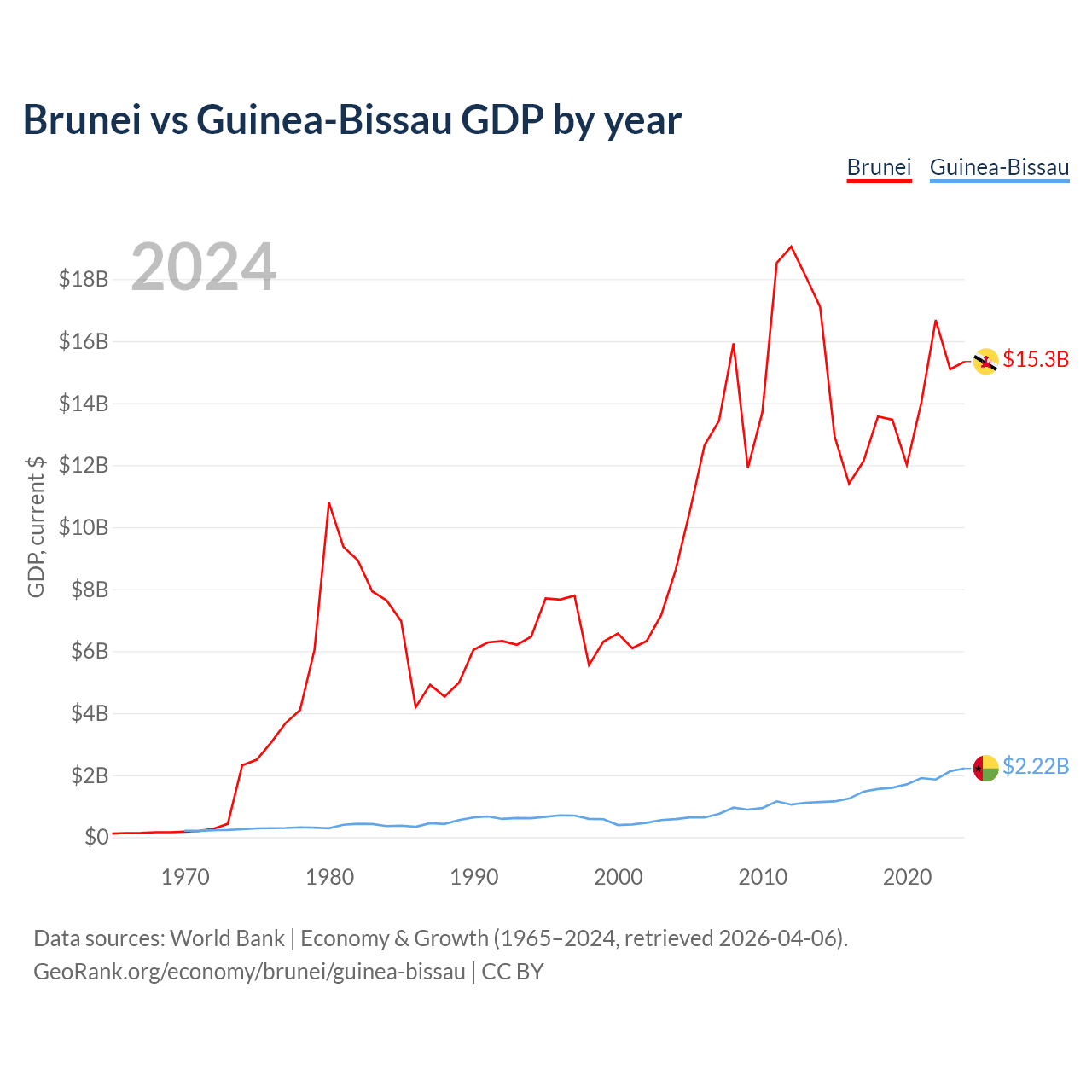 Brunei has a GDP of $15.3B compared to $2.22B for Guinea-Bissau, ranking 142/197 and 176/197 by economy size, respectively.