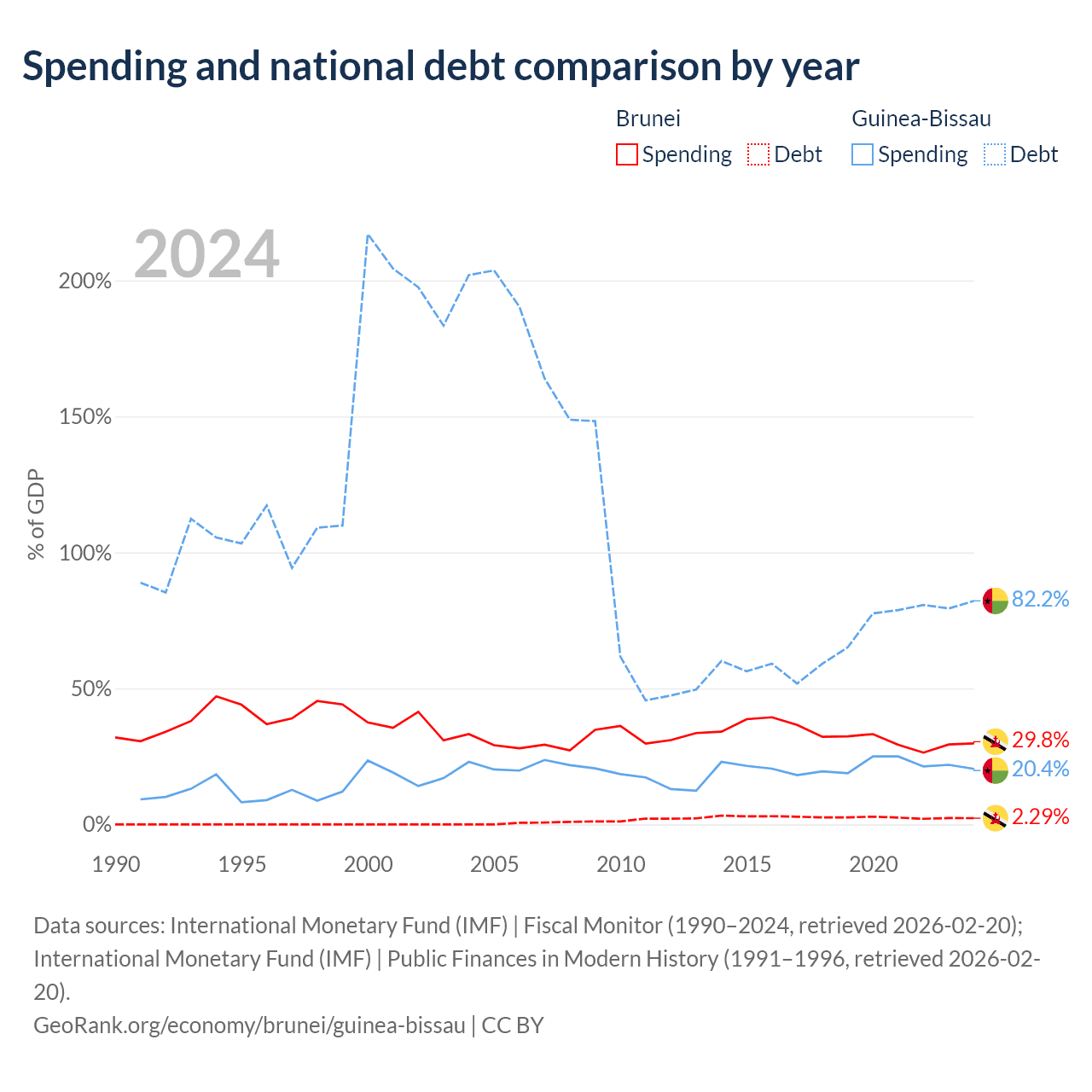 Brunei has $351M in government debt (2.29% of GDP), compared to $1.82B (82.2% of GDP) in Guinea-Bissau.