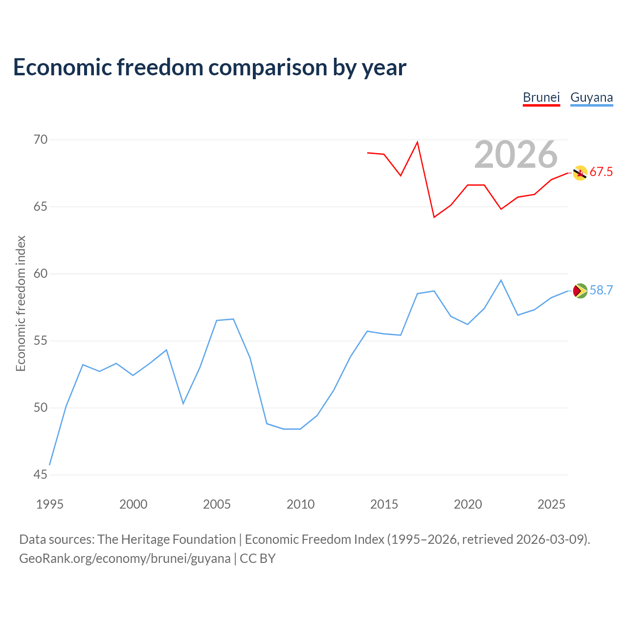 The Economic Freedom Index for Brunei is 67.5, ranking 55/197, compared to 58.7 for Guyana, ranking 109/197. The chart above displays a comparison of annual changes in economic freedom indexes.