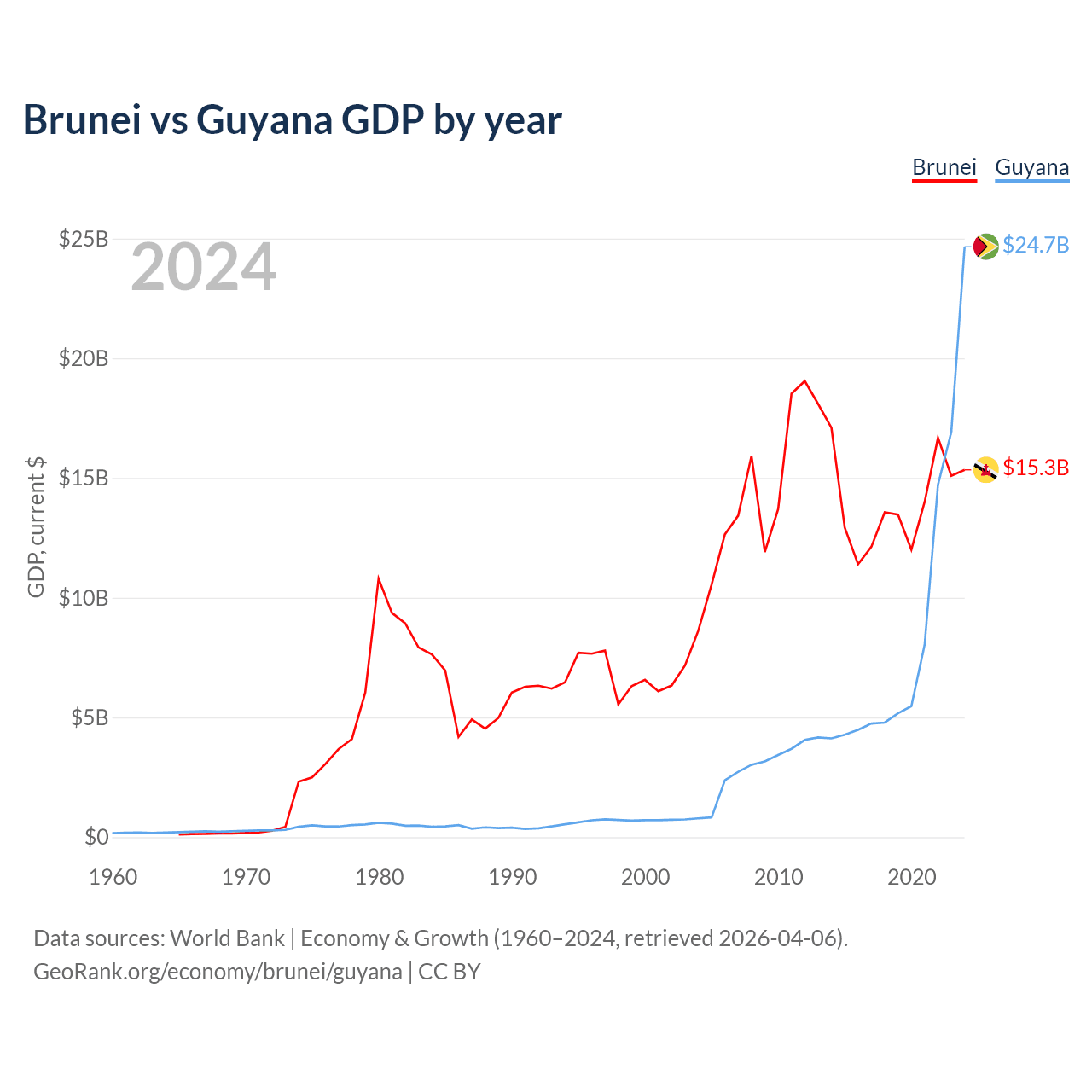 Brunei has a GDP of $15.3B compared to $24.7B for Guyana, ranking 142/197 and 120/197 by economy size, respectively.