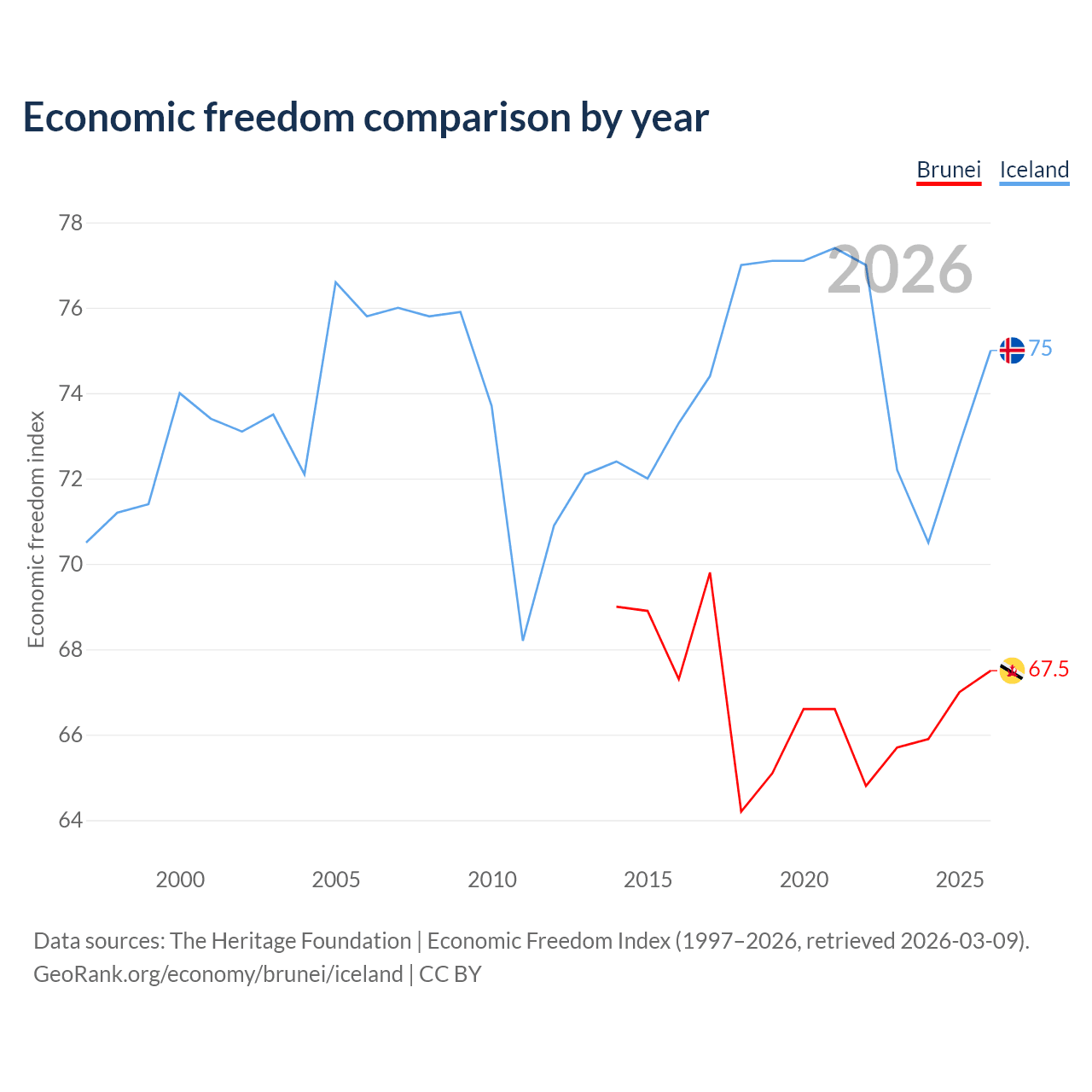 The Economic Freedom Index for Brunei is 67.5, ranking 55/197, compared to 75 for Iceland, ranking 19/197. The chart above displays a comparison of annual changes in economic freedom indexes.