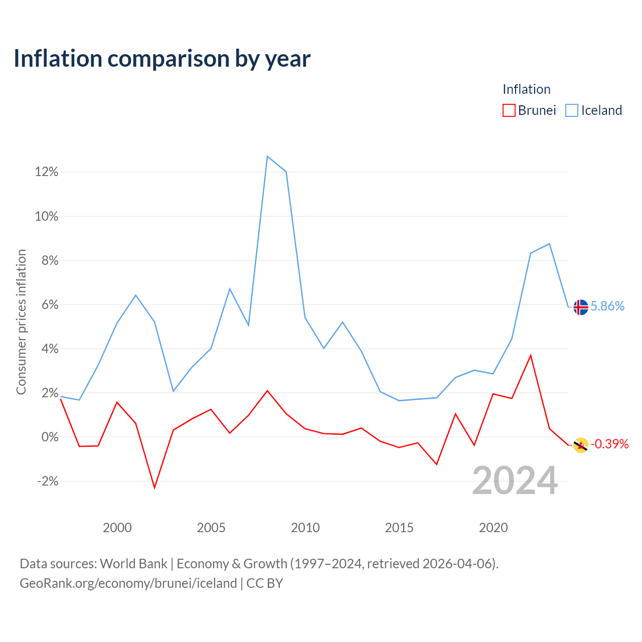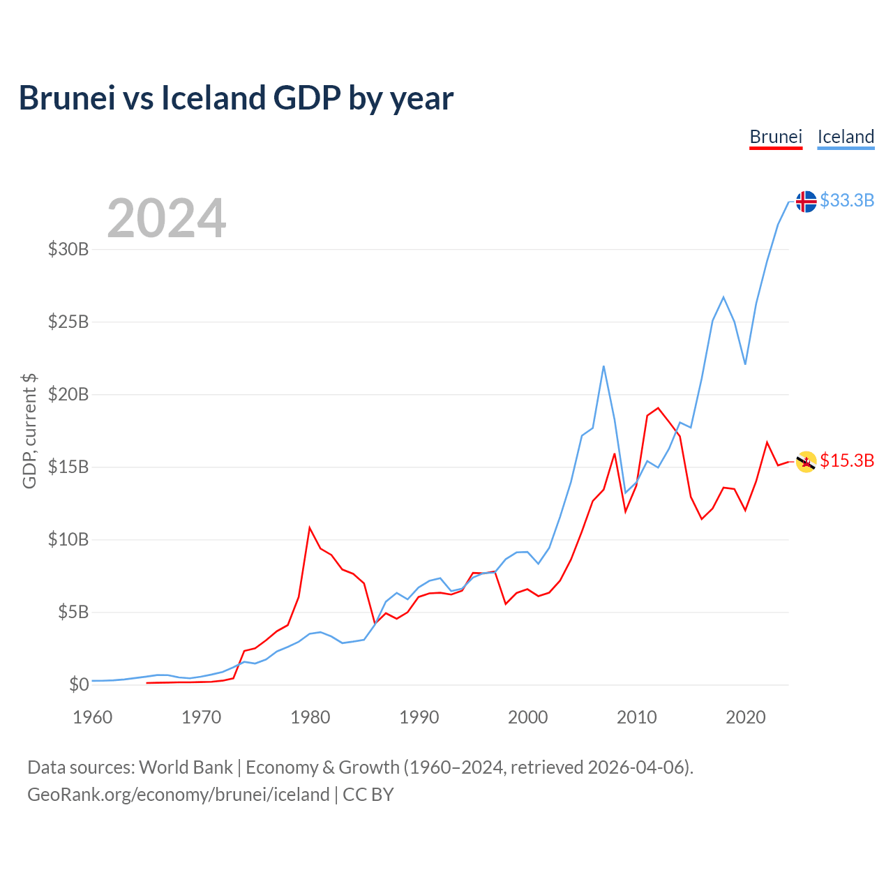 Brunei has a GDP of $15.3B compared to $33.3B for Iceland, ranking 142/197 and 108/197 by economy size, respectively.