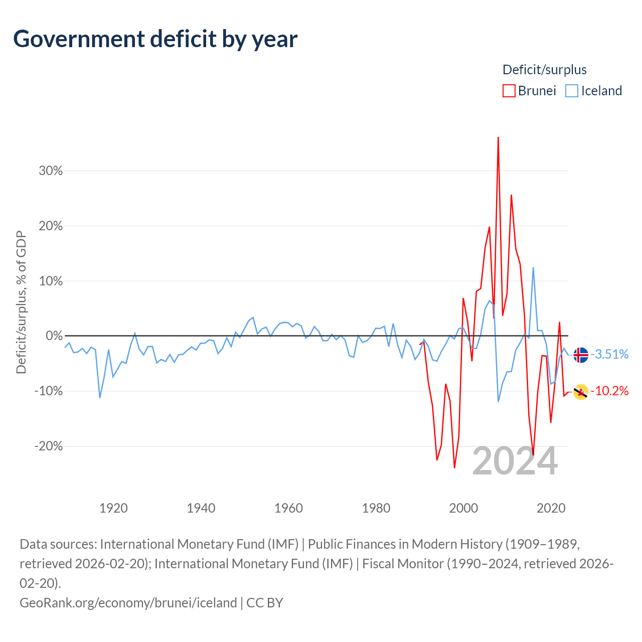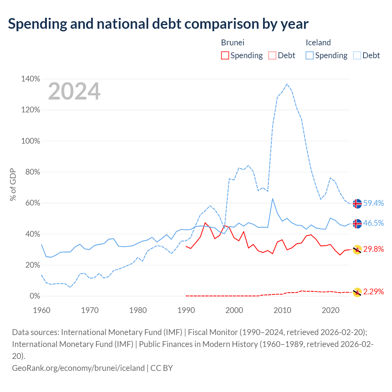 Brunei has $351M in government debt (2.29% of GDP), compared to $19.8B (59.4% of GDP) in Iceland.