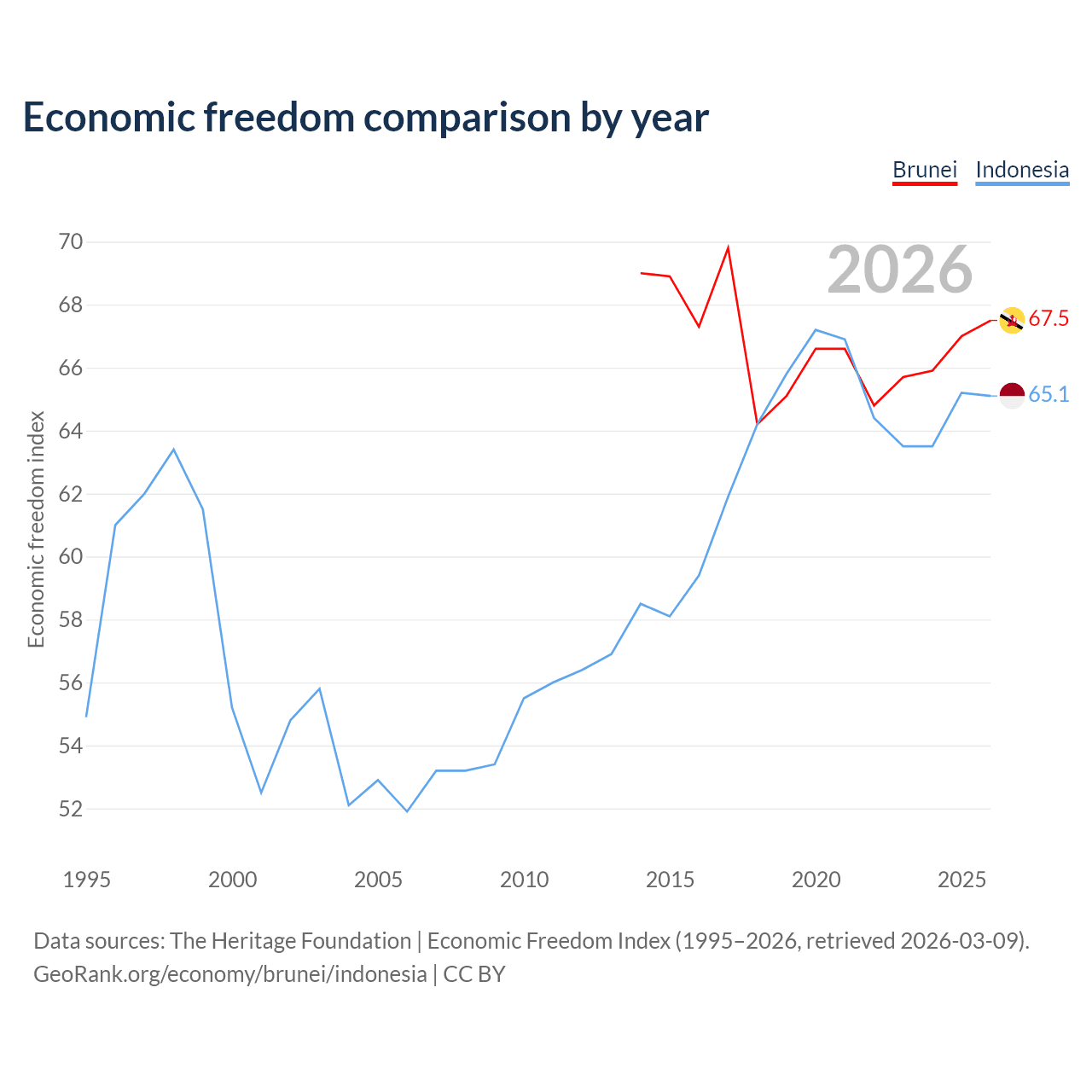 The Economic Freedom Index for Brunei is 67.5, ranking 55/197, compared to 65.1 for Indonesia, ranking 67/197. The chart above displays a comparison of annual changes in economic freedom indexes.
