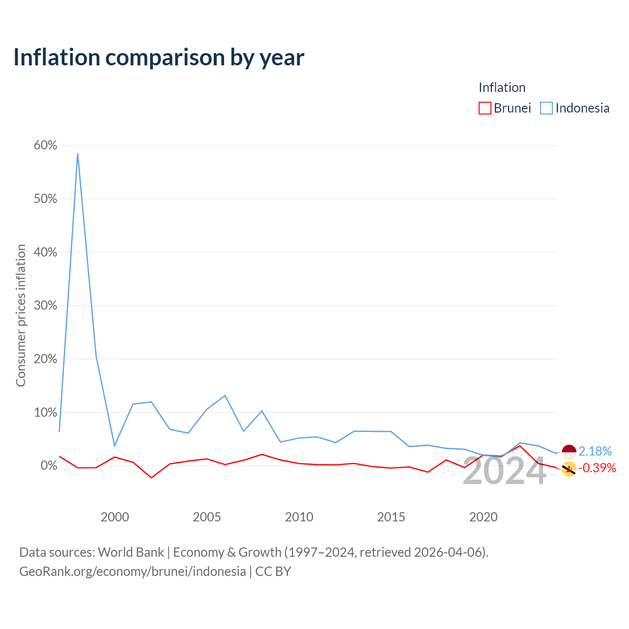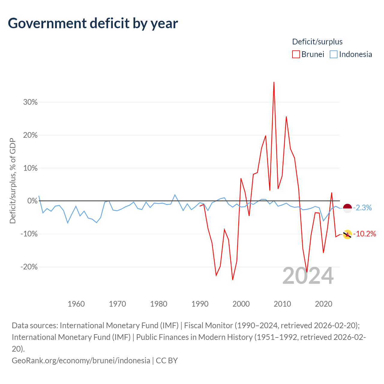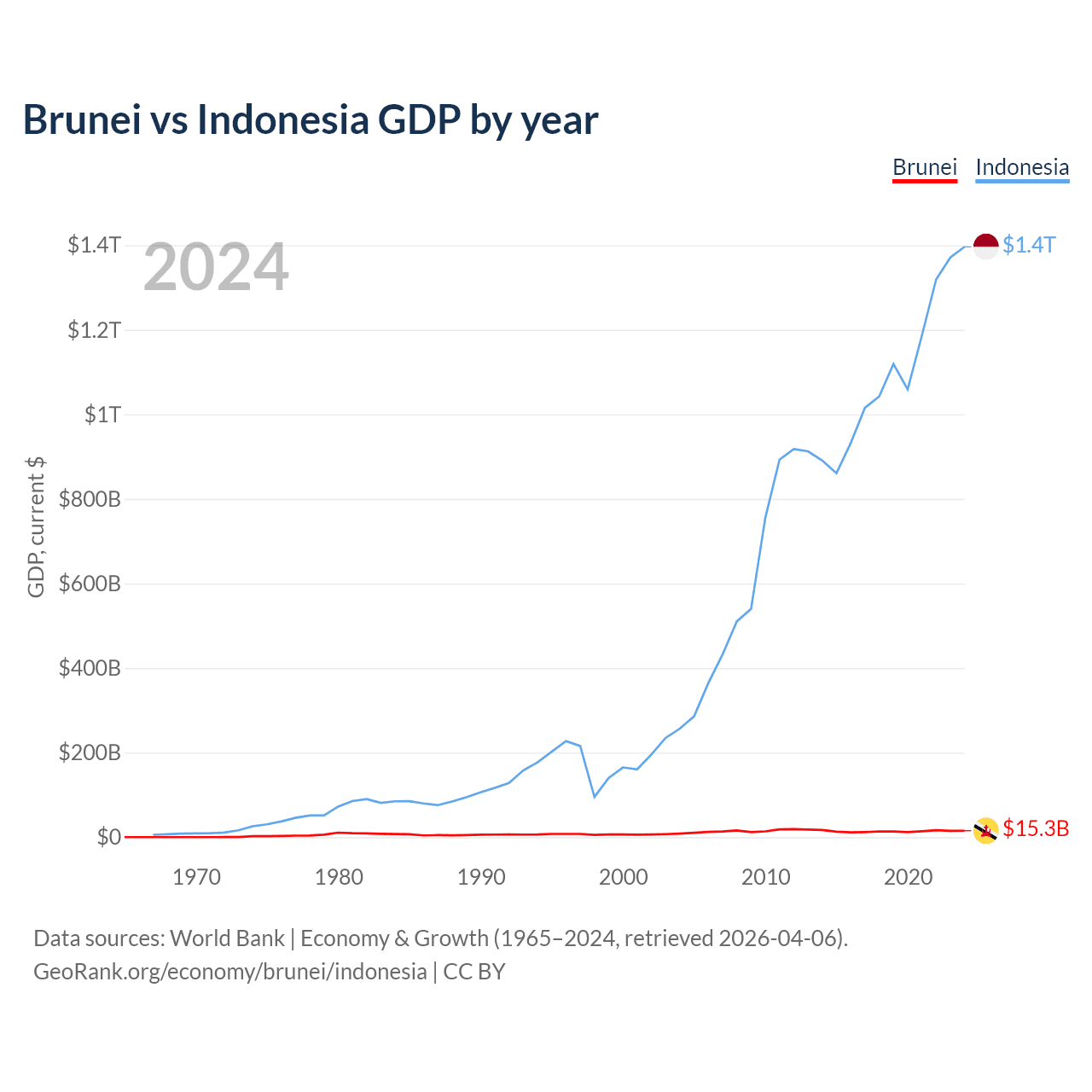 Brunei has a GDP of $15.3B compared to $1.4T for Indonesia, ranking 142/197 and 16/197 by economy size, respectively.