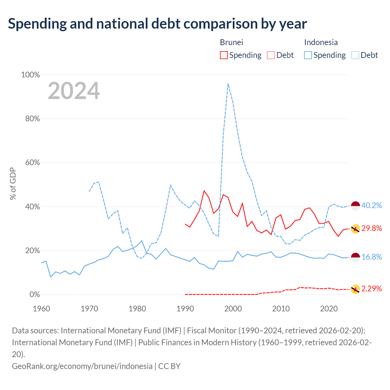 Brunei has $351M in government debt (2.29% of GDP), compared to $561B (40.2% of GDP) in Indonesia.