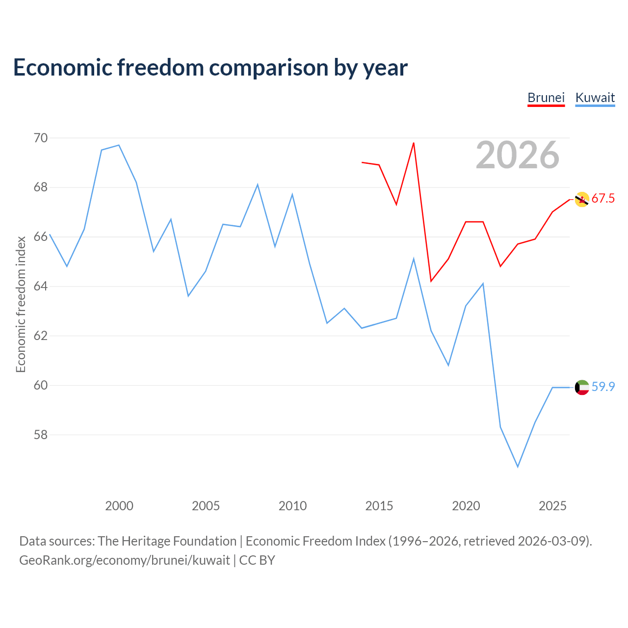 The Economic Freedom Index for Brunei is 67.5, ranking 55/197, compared to 59.9 for Kuwait, ranking 100/197. The chart above displays a comparison of annual changes in economic freedom indexes.