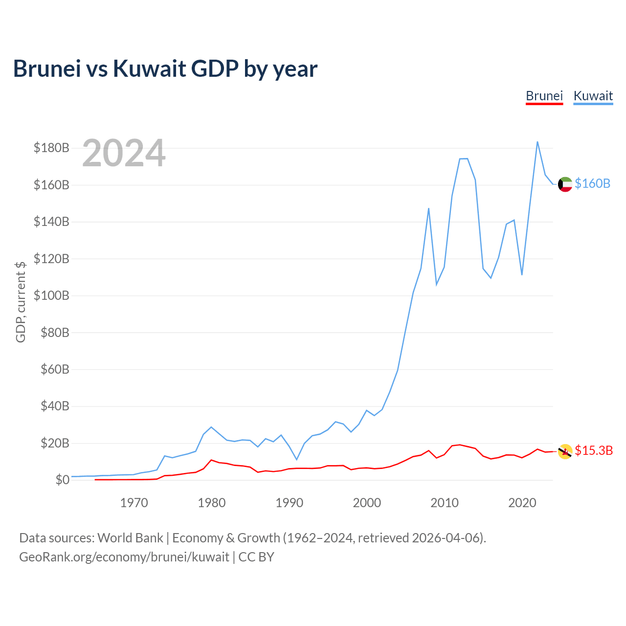 Brunei has a GDP of $15.3B compared to $160B for Kuwait, ranking 142/197 and 59/197 by economy size, respectively.