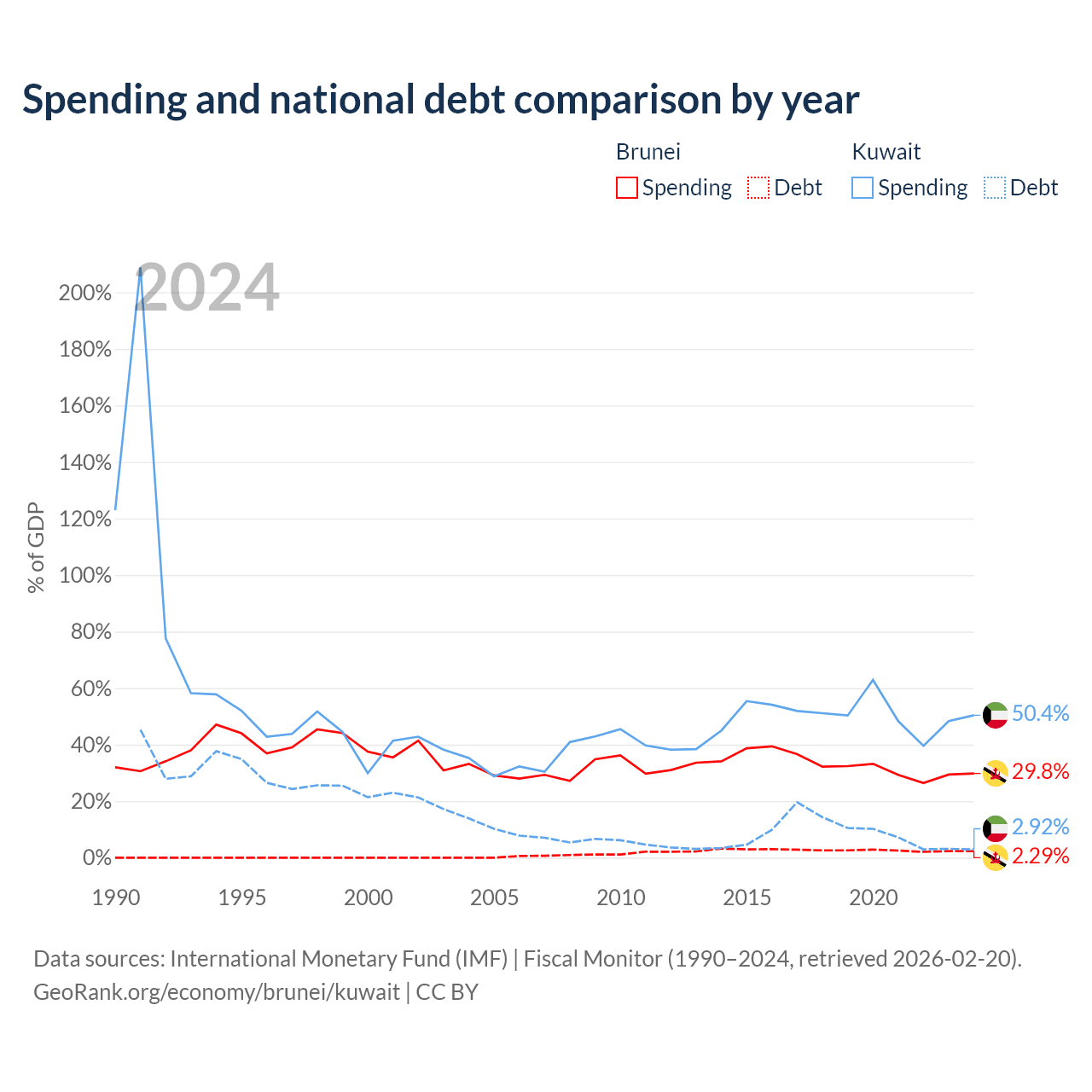 Brunei has $351M in government debt (2.29% of GDP), compared to $4.68B (2.92% of GDP) in Kuwait.