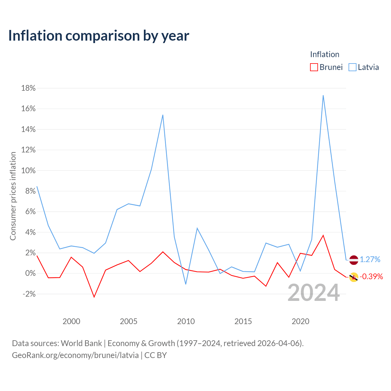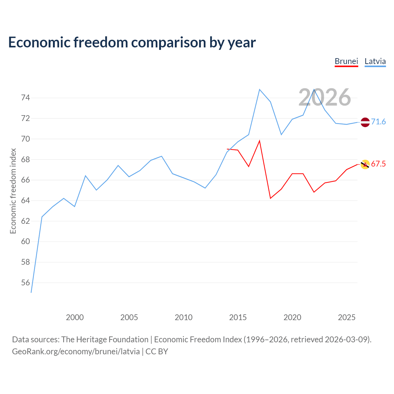 The Economic Freedom Index for Brunei is 67.5, ranking 55/197, compared to 71.6 for Latvia, ranking 31/197. The chart above displays a comparison of annual changes in economic freedom indexes.