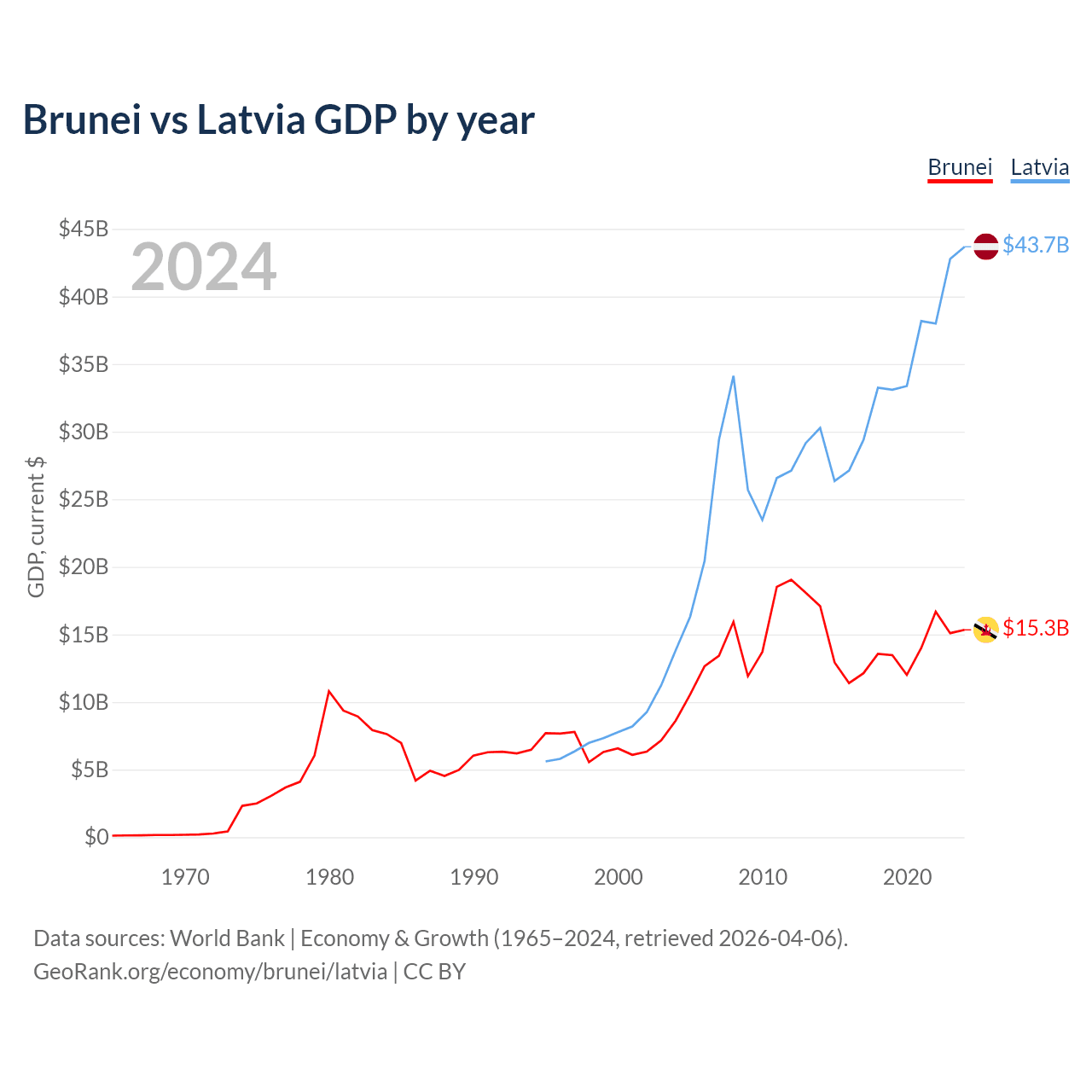 Brunei has a GDP of $15.3B compared to $43.7B for Latvia, ranking 142/197 and 99/197 by economy size, respectively.